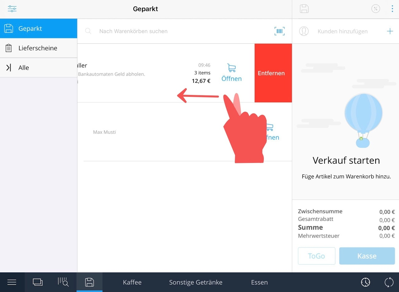 An overview appears with all parked sales and delivery notes. If you tap the "Shopping cart icon", the sale will be placed in the shopping cart and you can then settle it as usual. In addition, we have built in a filter function, which you can find in the upper left area of the screen. Here you can filter results by price, date, customer, employee and register.