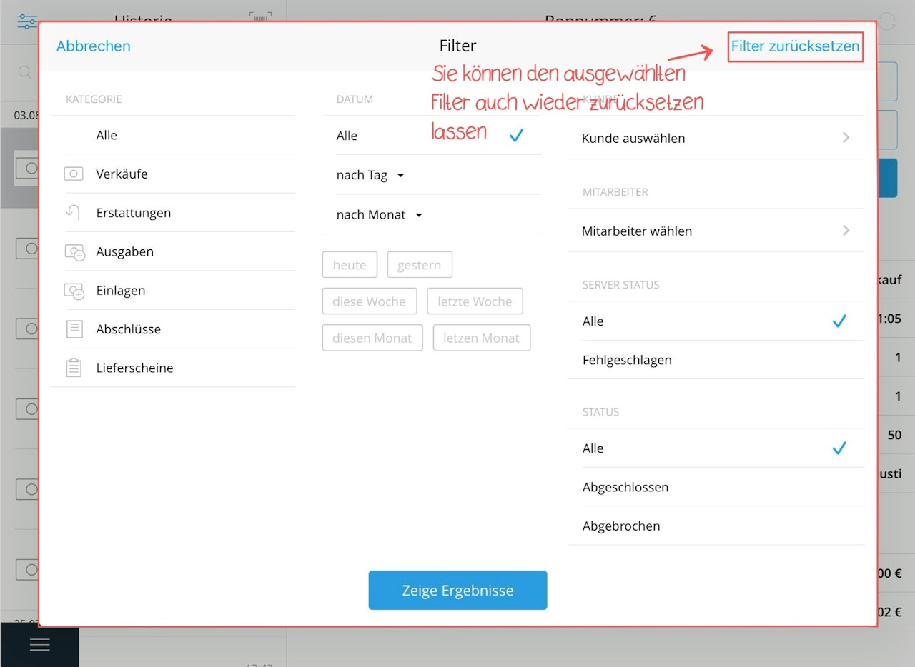 In this article, we introduce you to the history of your receipts and show you how to find and use the filter function. Navigate to the main menu of your app and tap on the menu item "History". Here you will find an overview of all completed sales, credit notes, etc. The symbol in the top left takes you to the filter menu. You can filter by category, date, customer, and status. Once you have selected all desired settings, tap "Show results": you will now see a list of your filtered results. If you want to reset the filters, open the filter menu again using the symbol and tap "Reset filters". Confirm again with "Show results":Now all transactions will be displayed again.