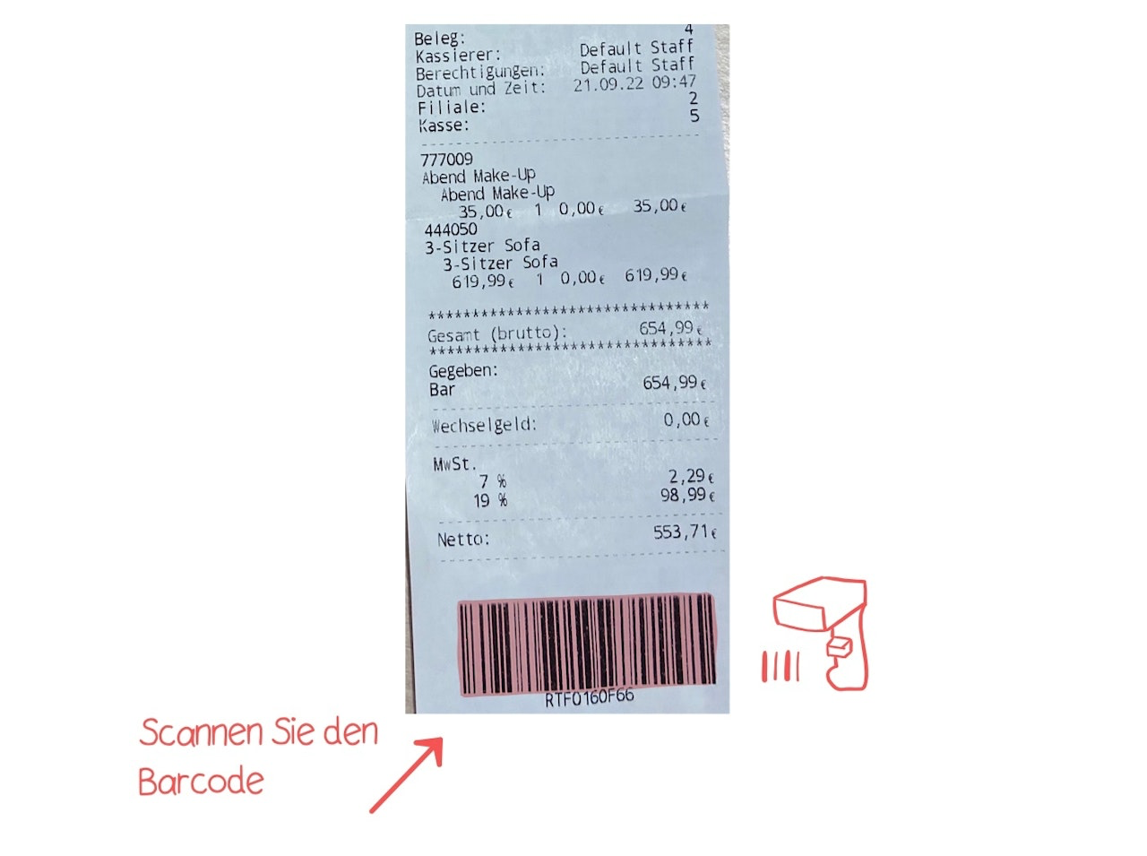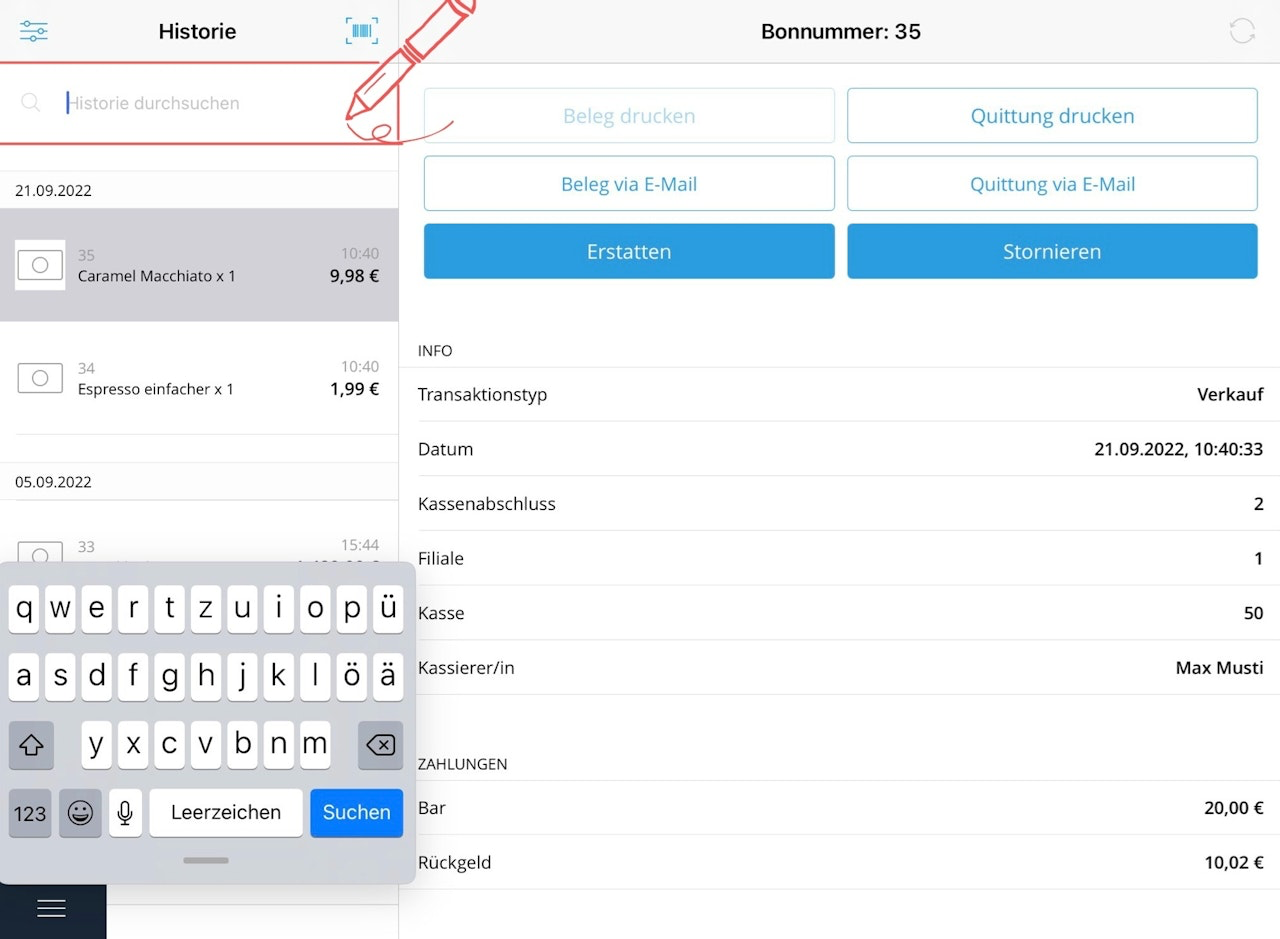 In addition, you have the following options to search through the history: You can search the history by entering the receipt number. You can scan the barcode of the receipt using an externally connected scanner to find the corresponding sale in the history.