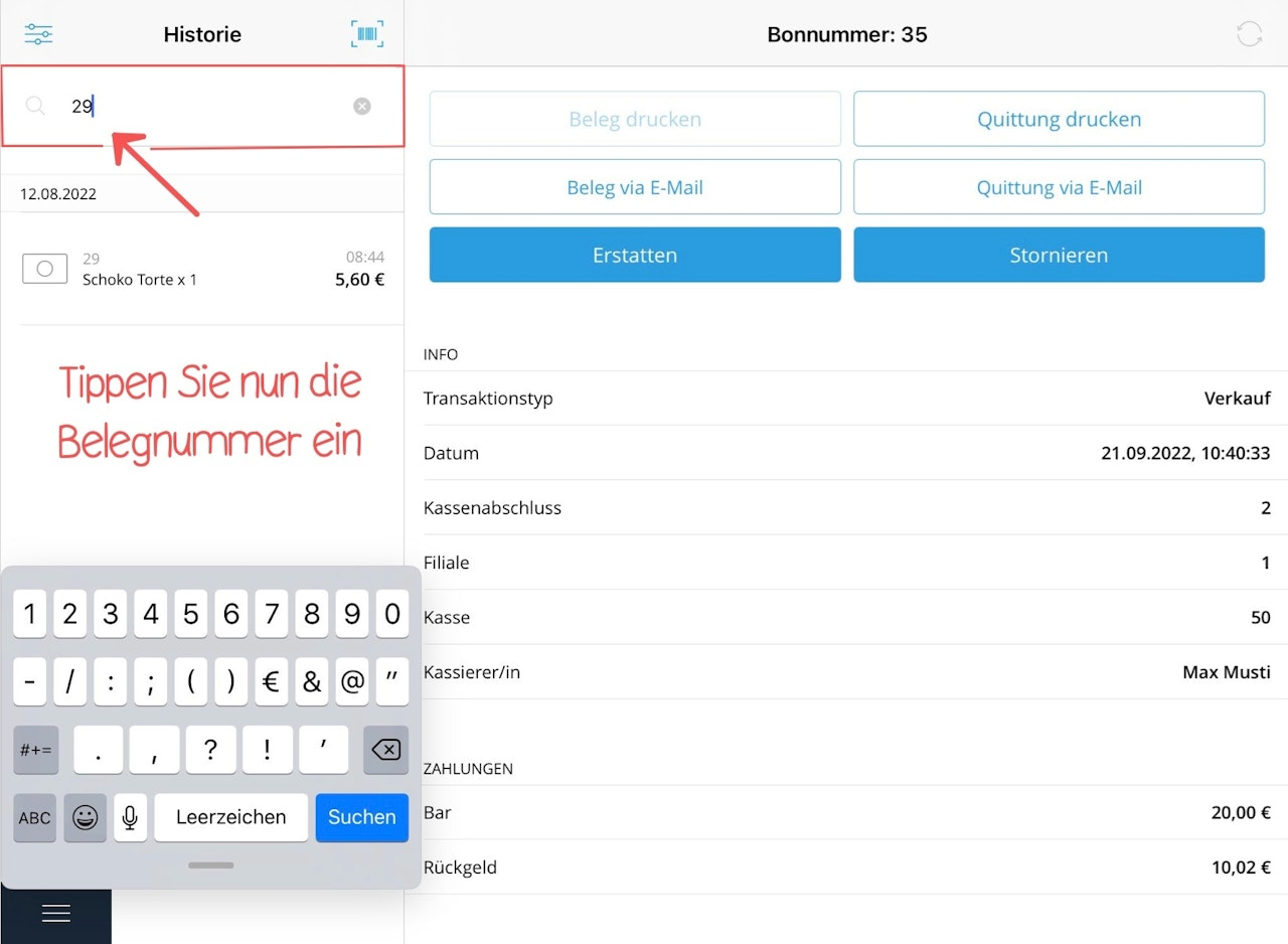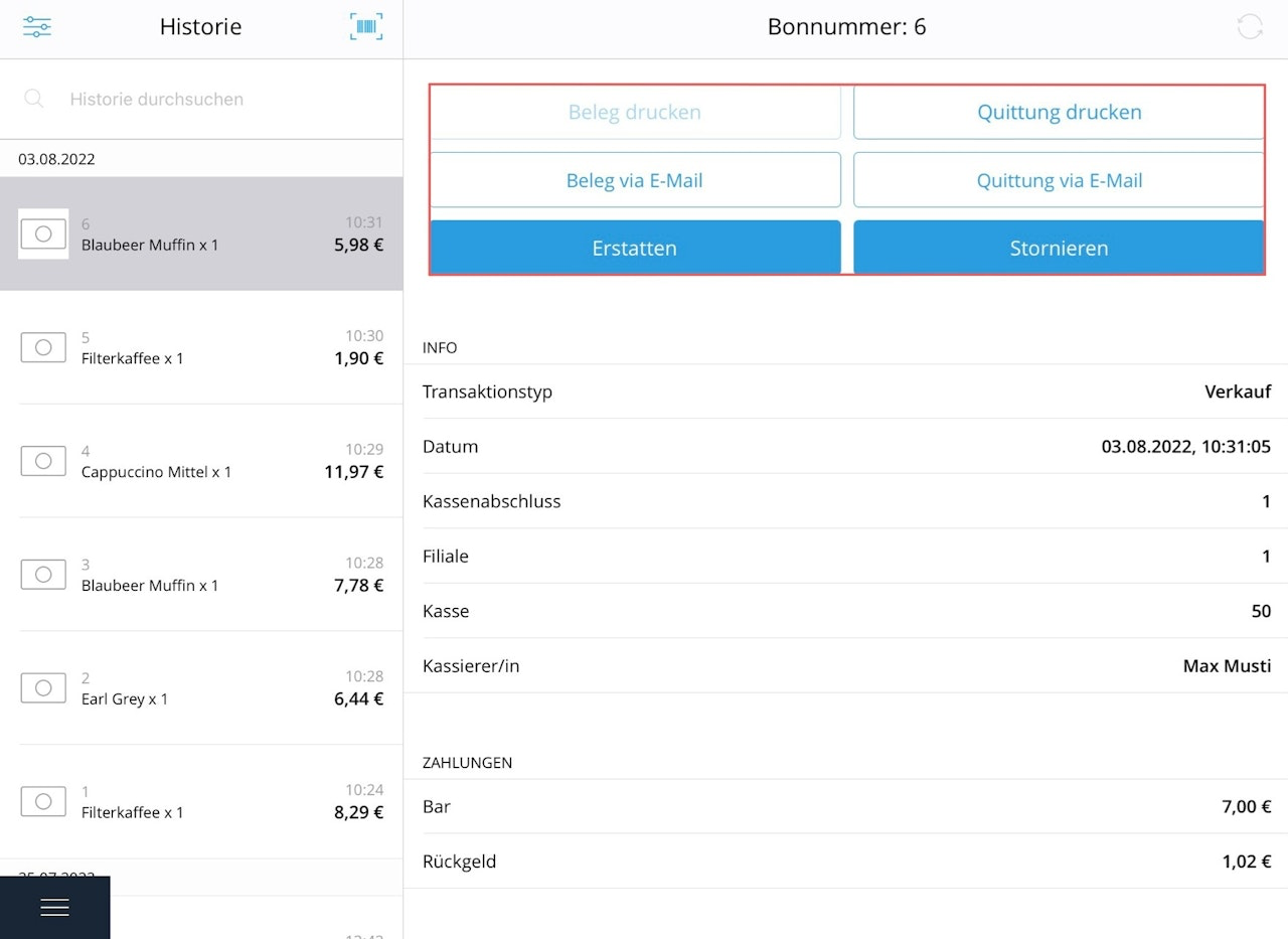 You can use the scanner function by tapping the barcode icon at the top right. This will automatically open the integrated iPad camera, with which you can scan the receipt. Once you have selected a transaction, you will receive an overview of all recorded data and a selection of available actions.