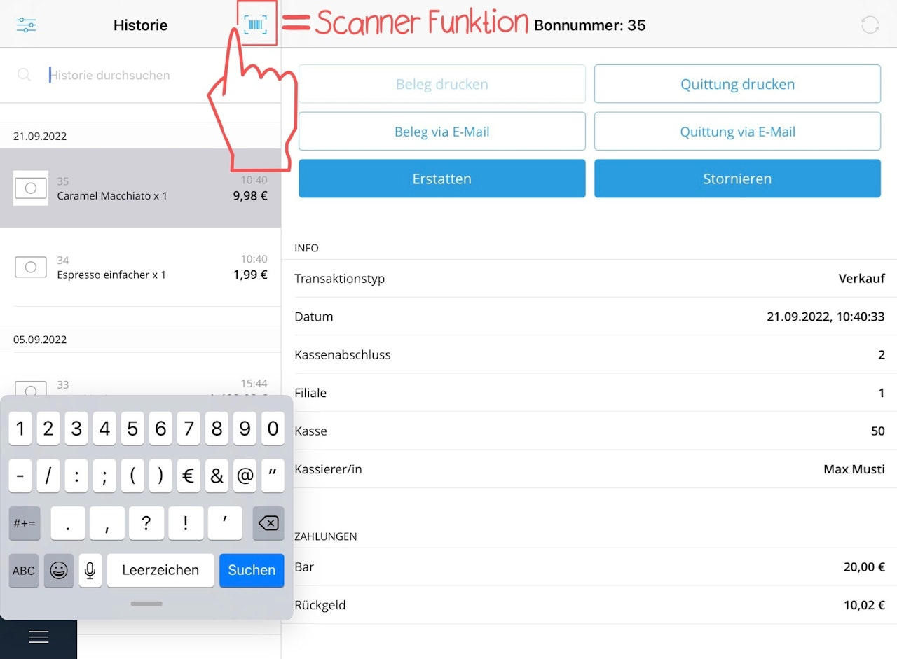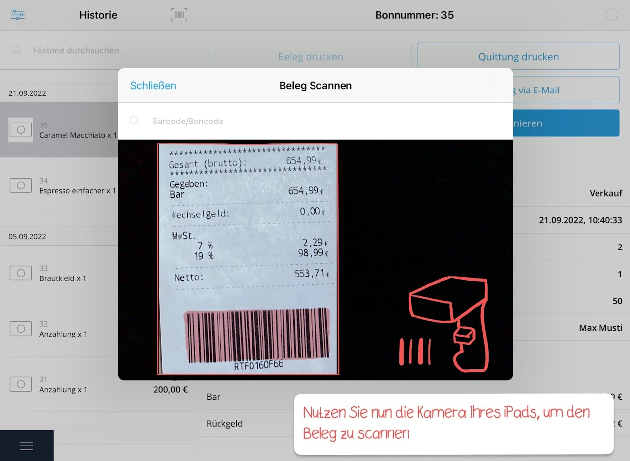 - You can use the scanner function by tapping the barcode icon at the top right. This will automatically open the integrated iPad camera, with which you can scan the receipt.
