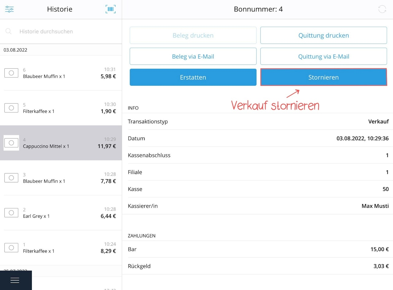 A cancellation always refers to the entire receipt! If you only want to refund individual items to your customer, you must refund the sale, not cancel it. Unlike the refund process, a cancellation prevents card payments from being debited from the cardholder's account. Tap first on the main menu and then on the "History" field. Select the blue "Cancel" field. In the new window, tap "Cancel" to reverse all payments. The refund will always suggest only the payment method that was used in the original sale.