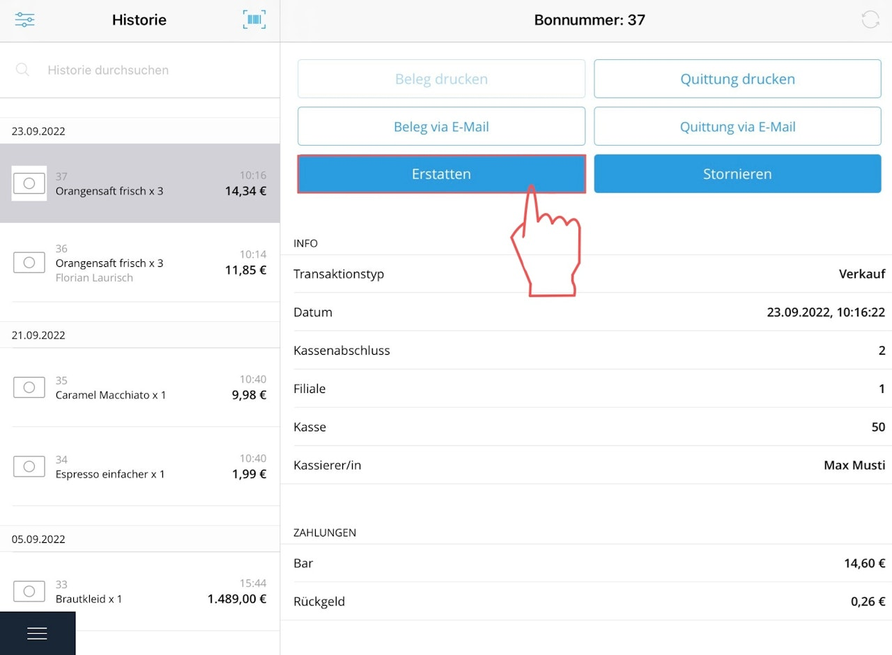 Note: Sales can be refunded both before and after a register closing. Unlike a cancellation, the refund process can also be performed for individual items on a receipt. Tap first on the main menu at the bottom left and then on the "History" field. All sales that were not cancelled during the register shift (marked with a small blue arrow) are eligible for a refund and can be selected.