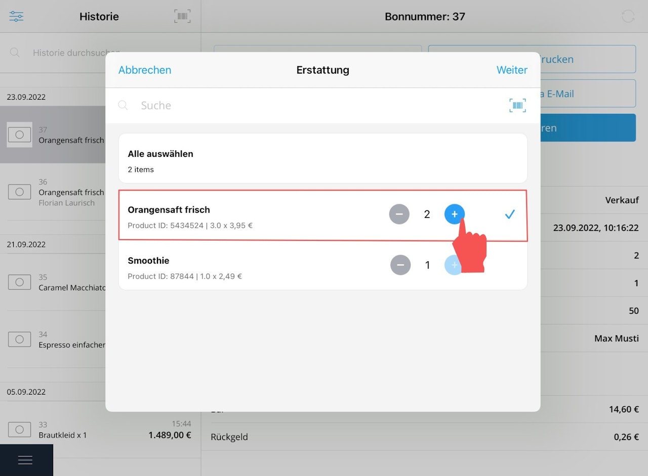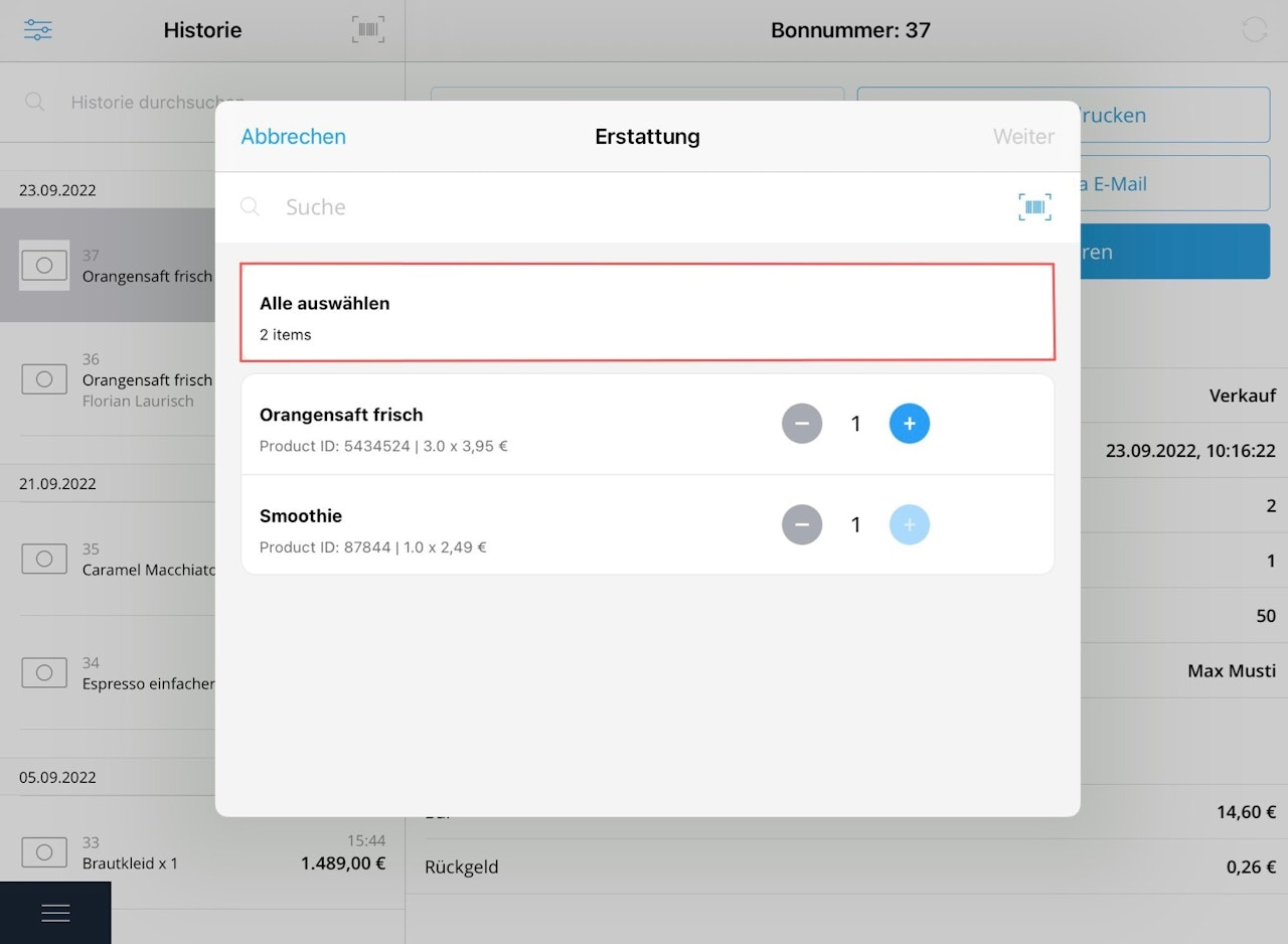 Once you have selected the correct receipt, tap the "Refund" button. A new pop-up window will open with all sales items. You can either select all items at once by tapping "Select all". Or you can select individual sales items. Your selection will be confirmed by a blue checkmark on the right edge. Using the plus and minus signs, you can specify the quantity you want to refund. For example, if you sold 3 x "Fresh orange juice" but want to refund only 2 of them, you increase the quantity using the plus sign by 2.