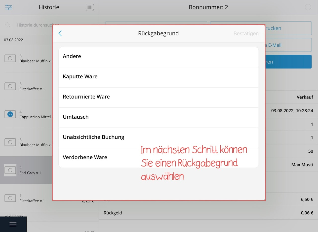 Once you have confirmed the quantity to be refunded via the "Next" button at the top right, another window with different return reasons will appear. Select a reason and optionally add a comment. In the next window, you can choose the payment method for the refund. Unlike a cancellation, the refund process allows you to choose freely between different payment methods. Done! You have refunded the sale.