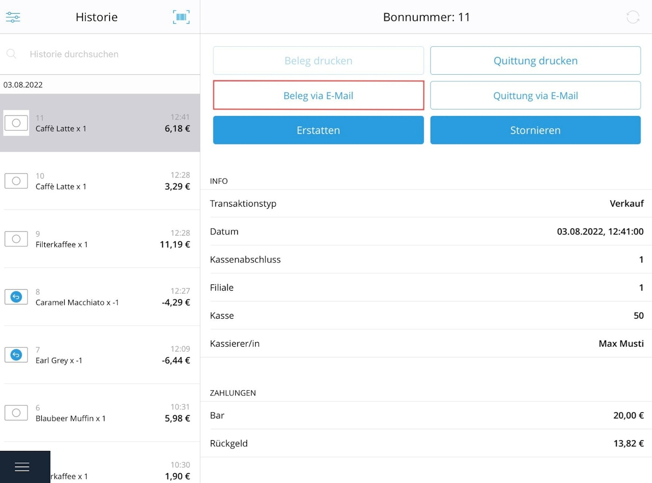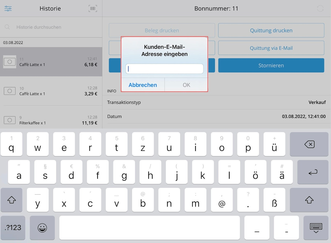 After each completed sale, you can print the receipt or send it to the customer via email. If you want to send a receipt by email at a later time, follow these steps: Tap on the main menu at the bottom left and select "History". Select a sale from the list on the left. You can also search for specific terms. The selected sale will be displayed on the right side of the screen. Then select the field "Send receipt via email". Now enter the customer's email address in the window and send the receipt by tapping "OK". Done! You have sent your receipt by email.