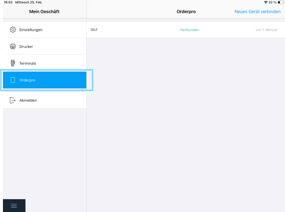 If you want to disconnect an Orderpro device from a register, tap the main menu icon in the top left corner.