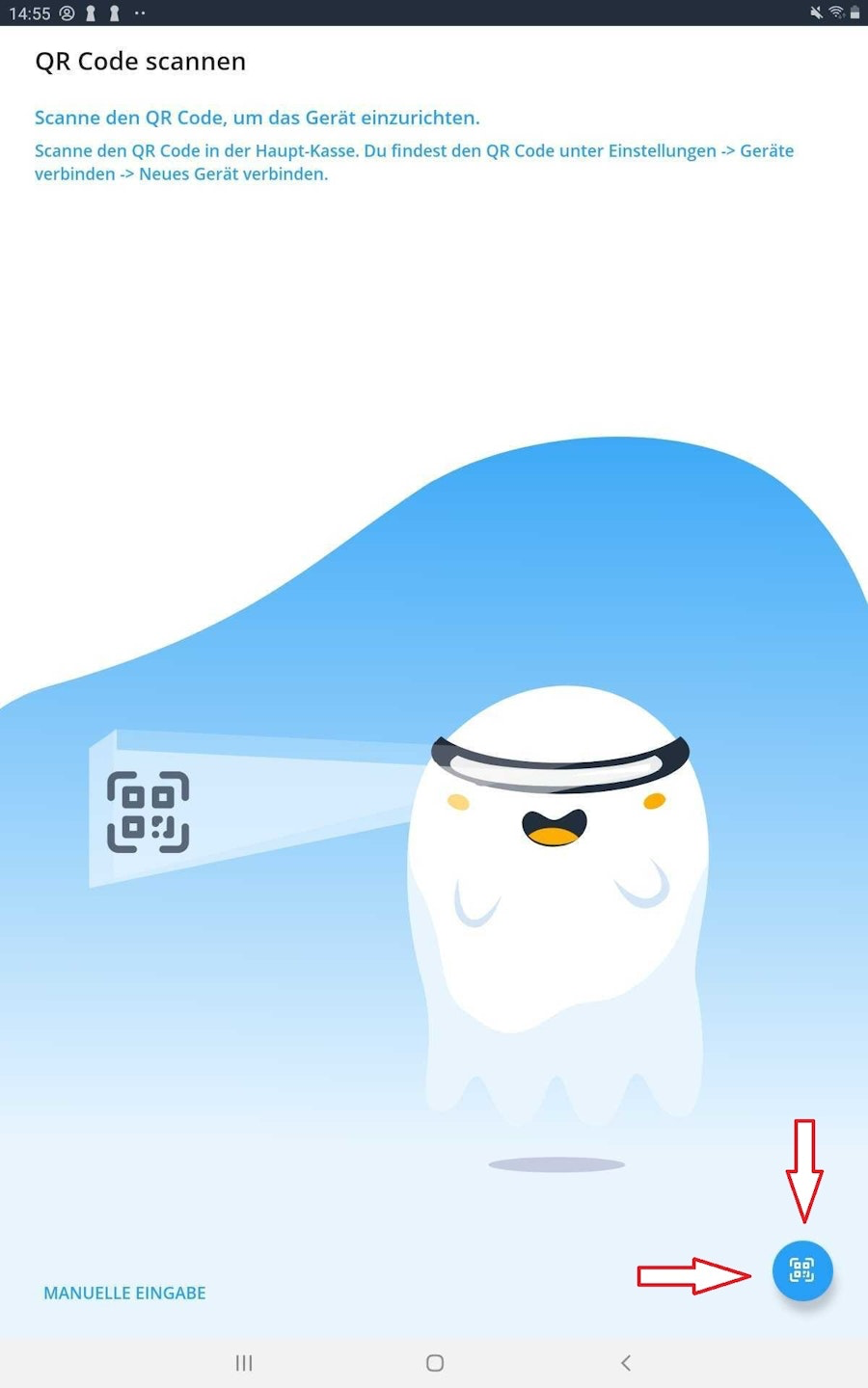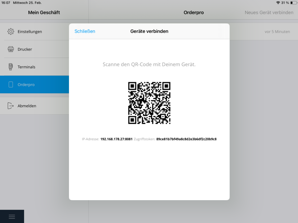 To connect a new device, press "Connect New Device", which appears on the right side of the screen. A QR code will now appear on your Tillhub Gastro POS. Tap the blue button in the bottom right of your Orderpro Plus device and scan the QR code using the camera of your Orderpro device (Pax A920).