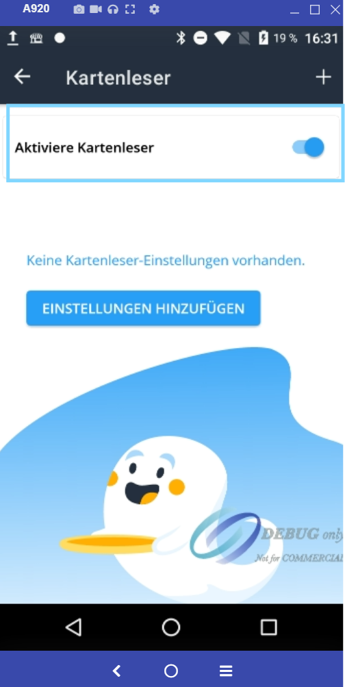 After tapping "Activate Card Reader", the option "Add Settings" will appear at the bottom. Select this to begin setting up the terminal.