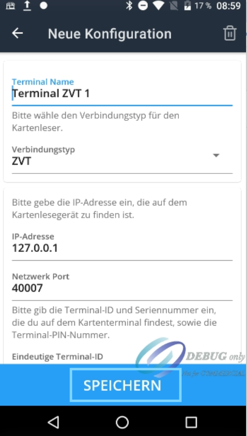 In the next step, tap "Connection Type". Here, select "ZVT". Once ZVT has been selected, the required fields will be filled in automatically. In most cases, no further manual input is necessary. Then tap "Save" at the bottom to complete the setup.