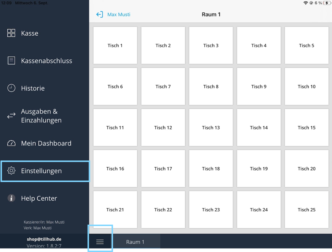 After connecting your Orderpro device with the iPad register, all employee profiles created in the Tillhub Gastro App will be displayed. Your employees can now log into the Orderpro devices using their individual PIN codes. To switch users, simply tap on the menu icon in the top left corner.You will now see the currently logged-in employee profile at the top left, showing the name and employee number. When you tap on it, the employee overview with all created profiles will appear again (as described above). You are now logged out. This overview will remain visible until someone logs into one of the profiles again.