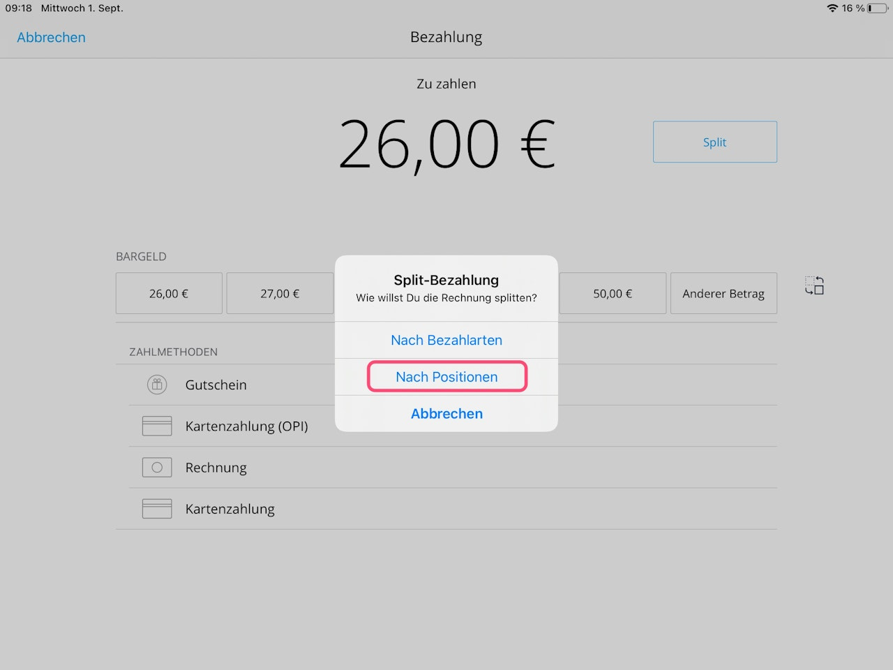 During the checkout process in your cashier interface, tap the Split button.