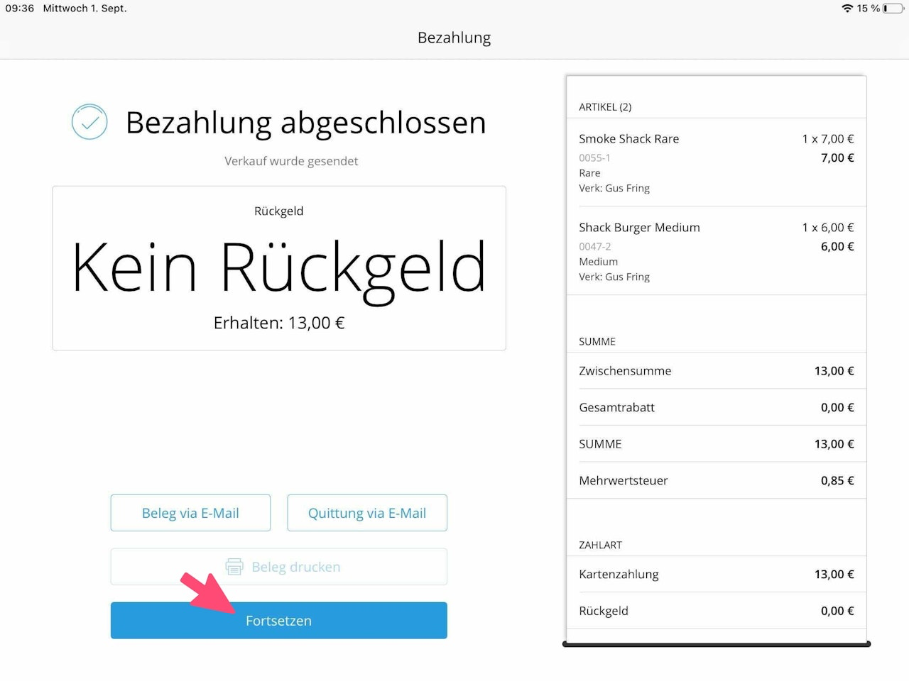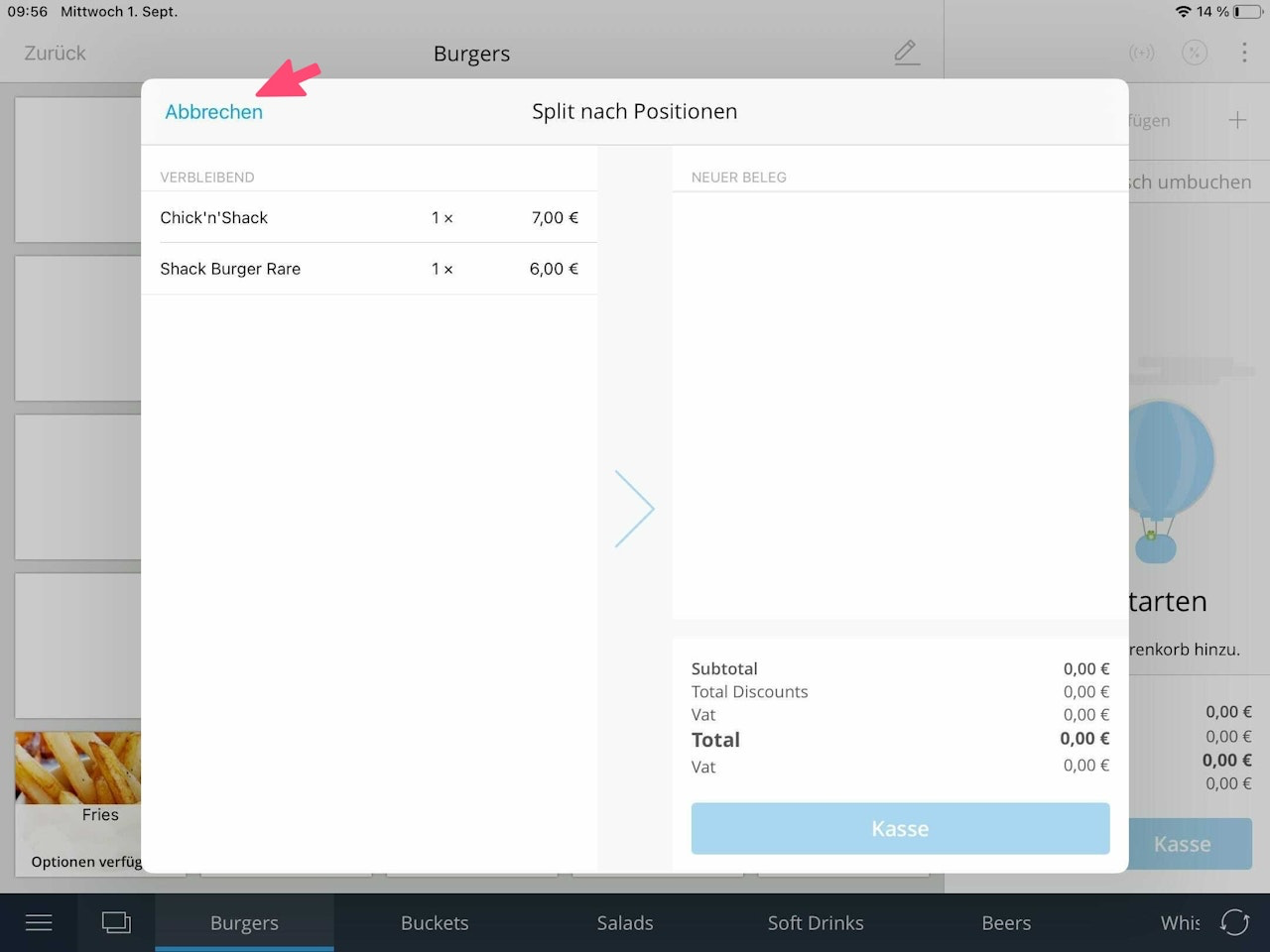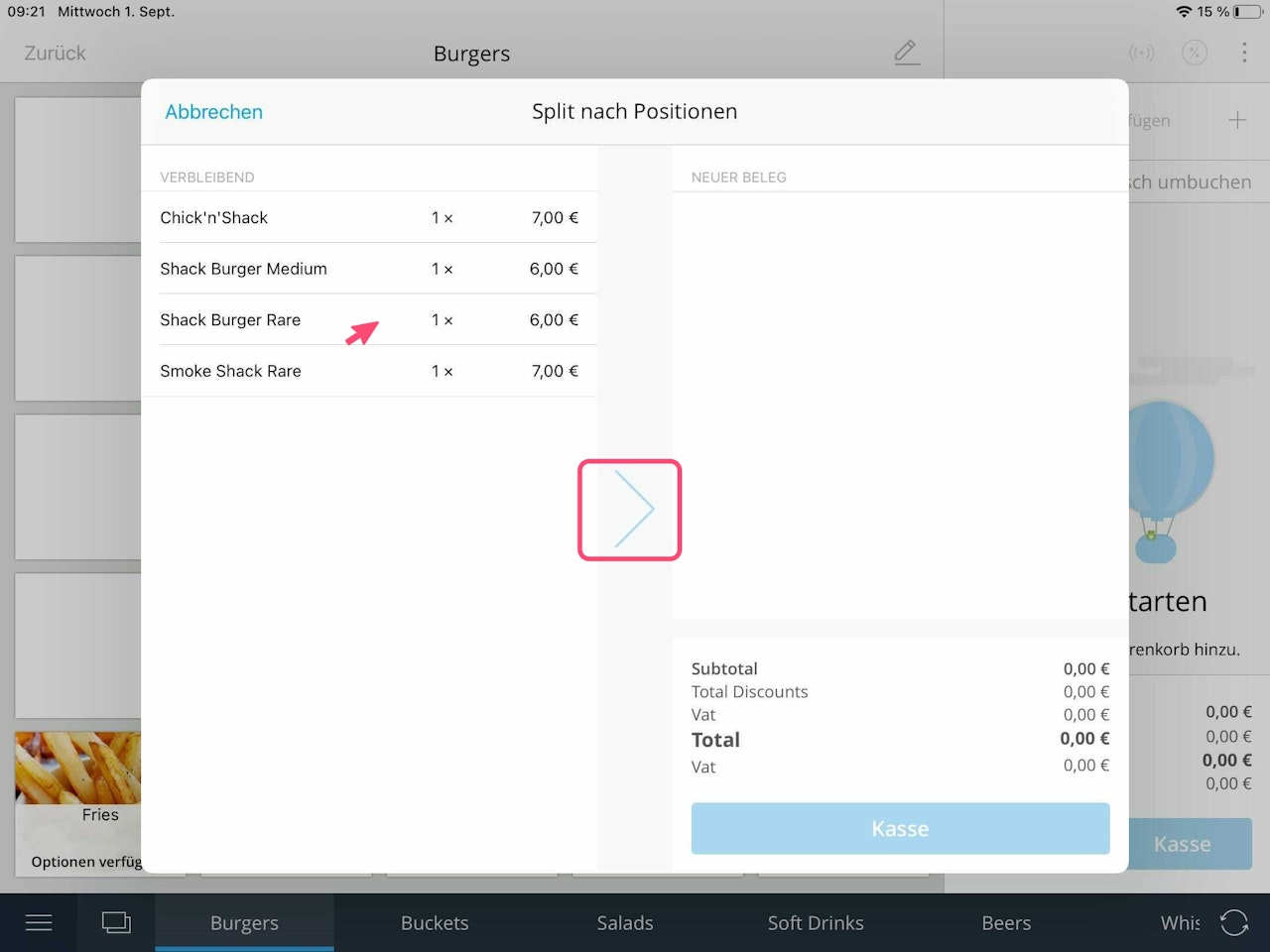When you tap on the desired item, it is transferred from left to right onto a new receipt (Image 2).