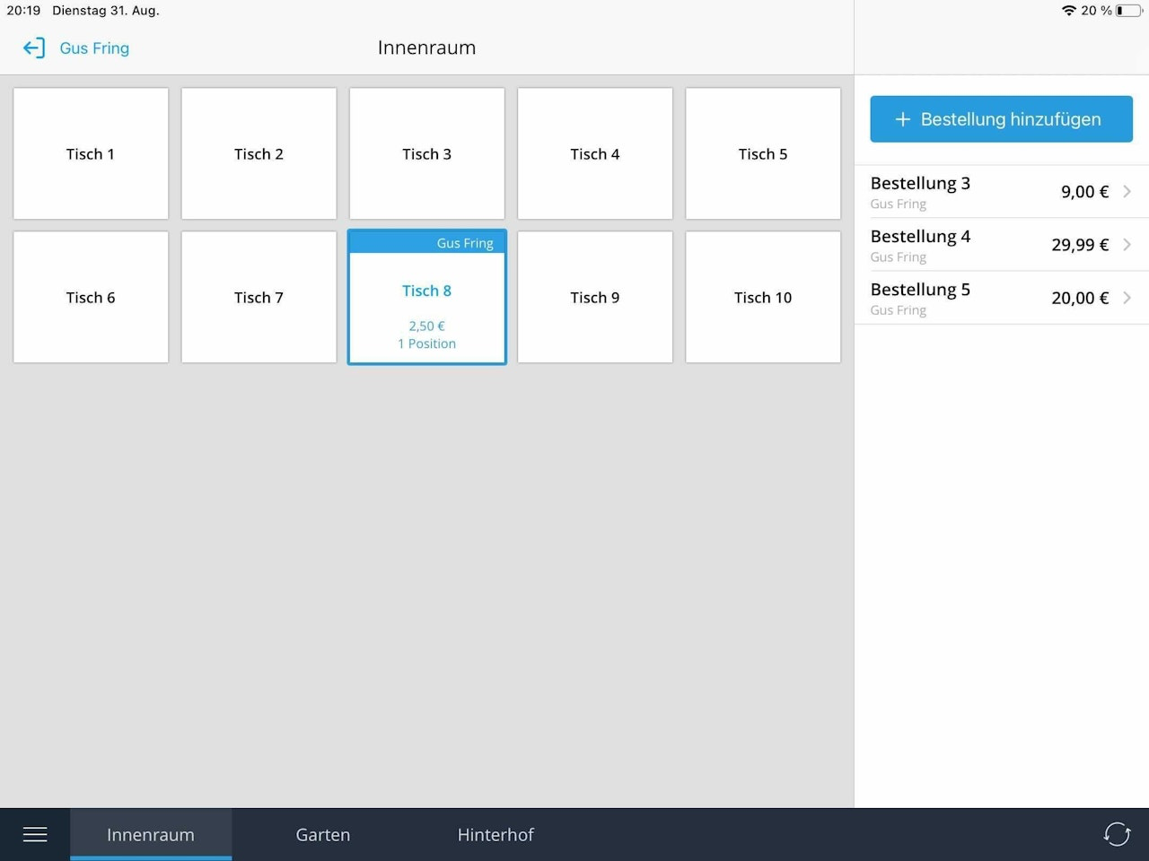 By tapping on the corresponding table, another window opens showing a list of existing orders. If you select the "As own party" option in this window, this order is assigned to the table as an additional independent order.