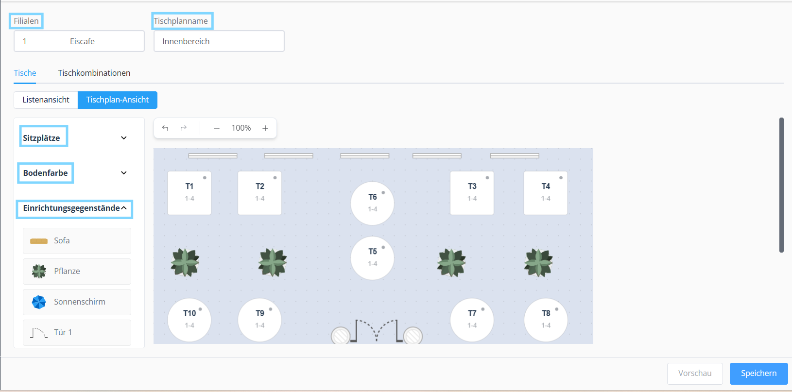 The new version also allows you to design your rooms in a realistic and visually appealing way. You can move tables around freely in the room, add furnishings, choose the floor color, and insert additional text and shapes. This allows you to replicate the actual room layout very accurately.