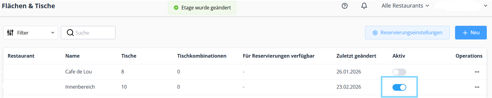 In the new version, all room and table setup and management is done centrally in the dashboard. Once the feature has been activated by support, select “Areas & Tables” from the menu.