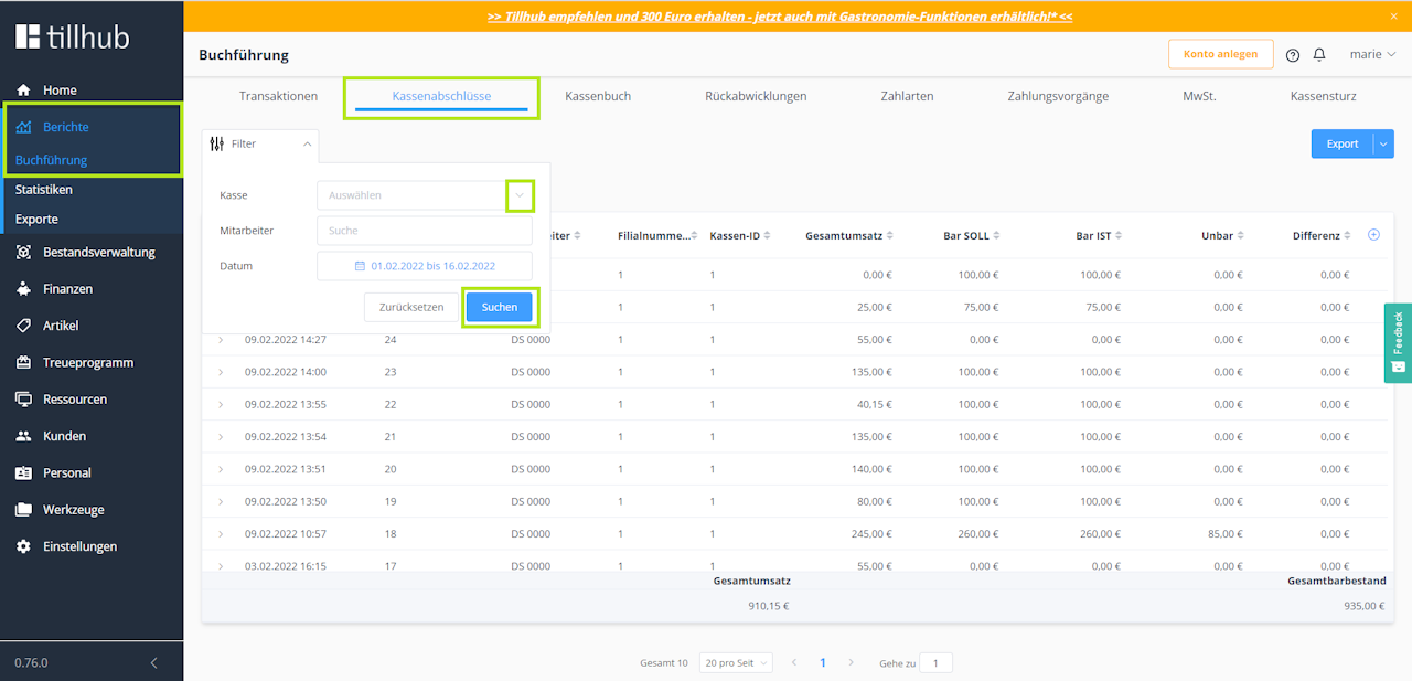 Once you have selected the desired period, confirm it by clicking "Search". Only cash register closures from the selected period will then be displayed.
