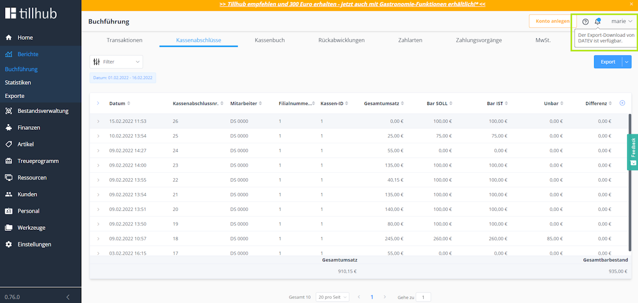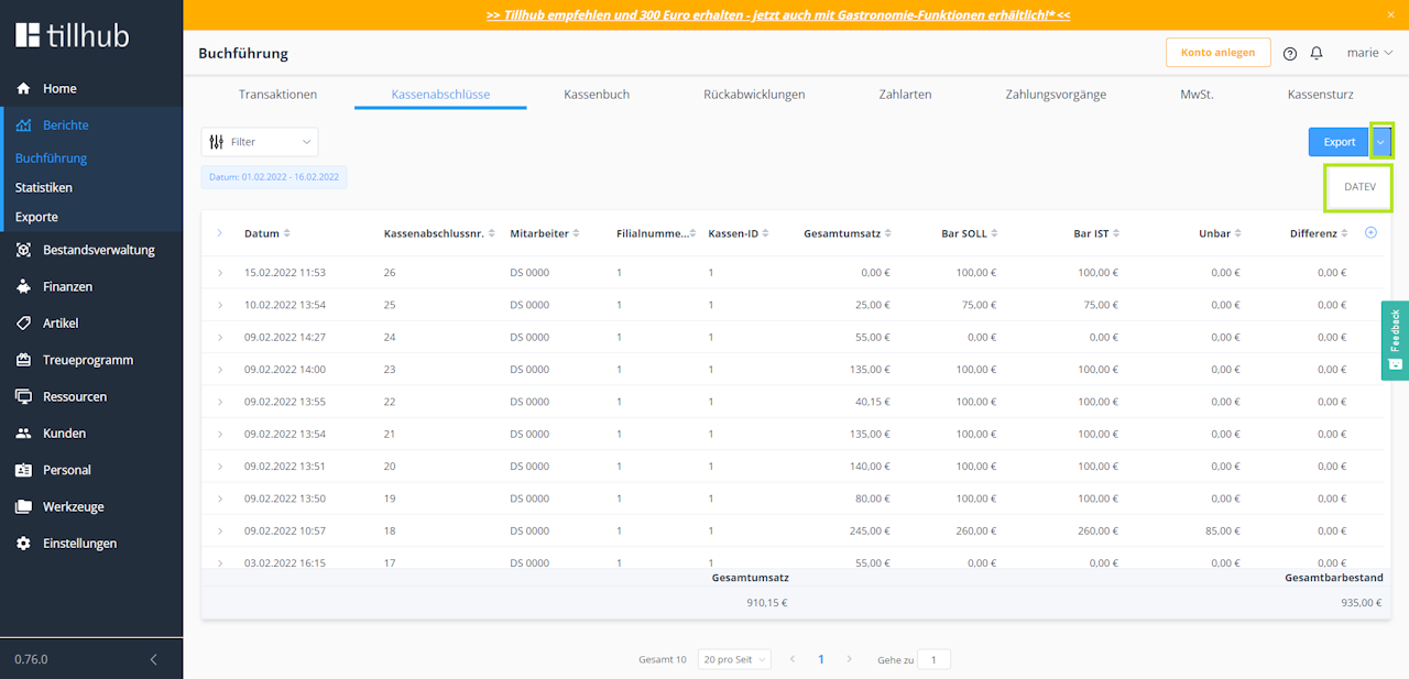 Note: In the following articles, we will show you how a DATEV export can be generated in the dashboard.
