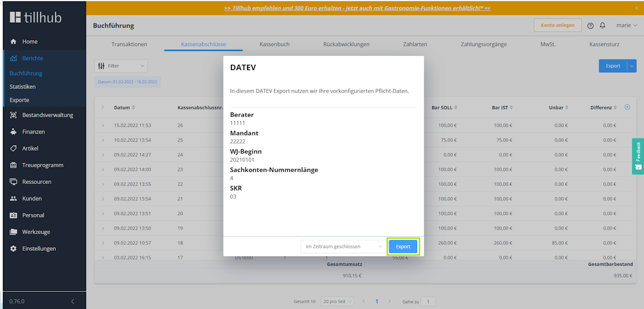 Note: If the drop-down menu is not displayed, please contact Tillhub Support. If you have not booked the DATEV export function, you can order it later through our sales team at +49 30 346 496 43.