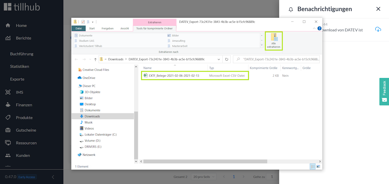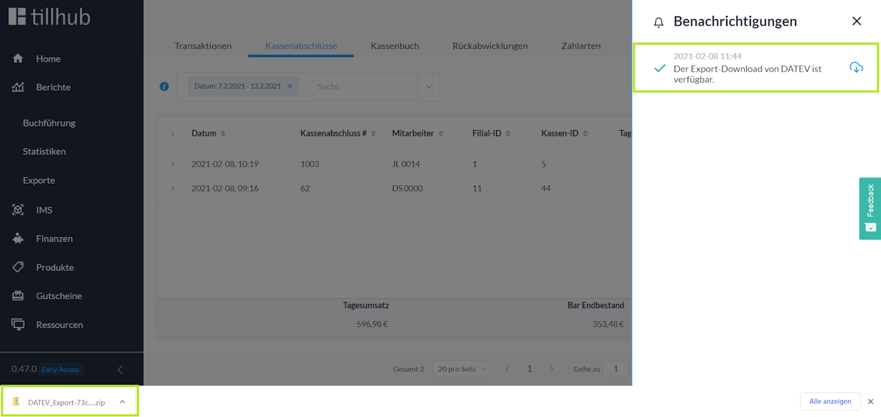Clicking on the bell icon will take you to your notifications where you can download the DATEV export by clicking on the notification or the "Download" icon.