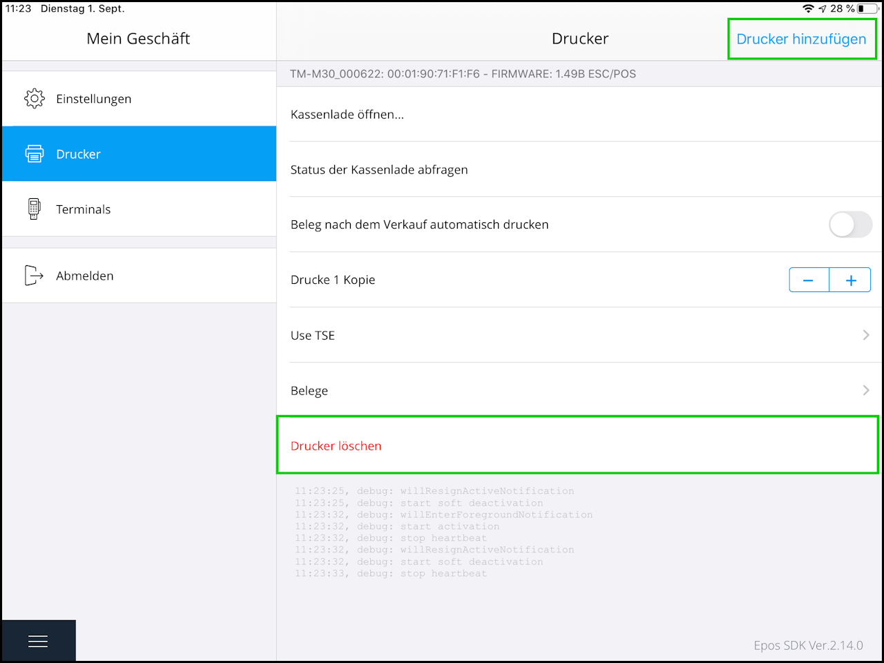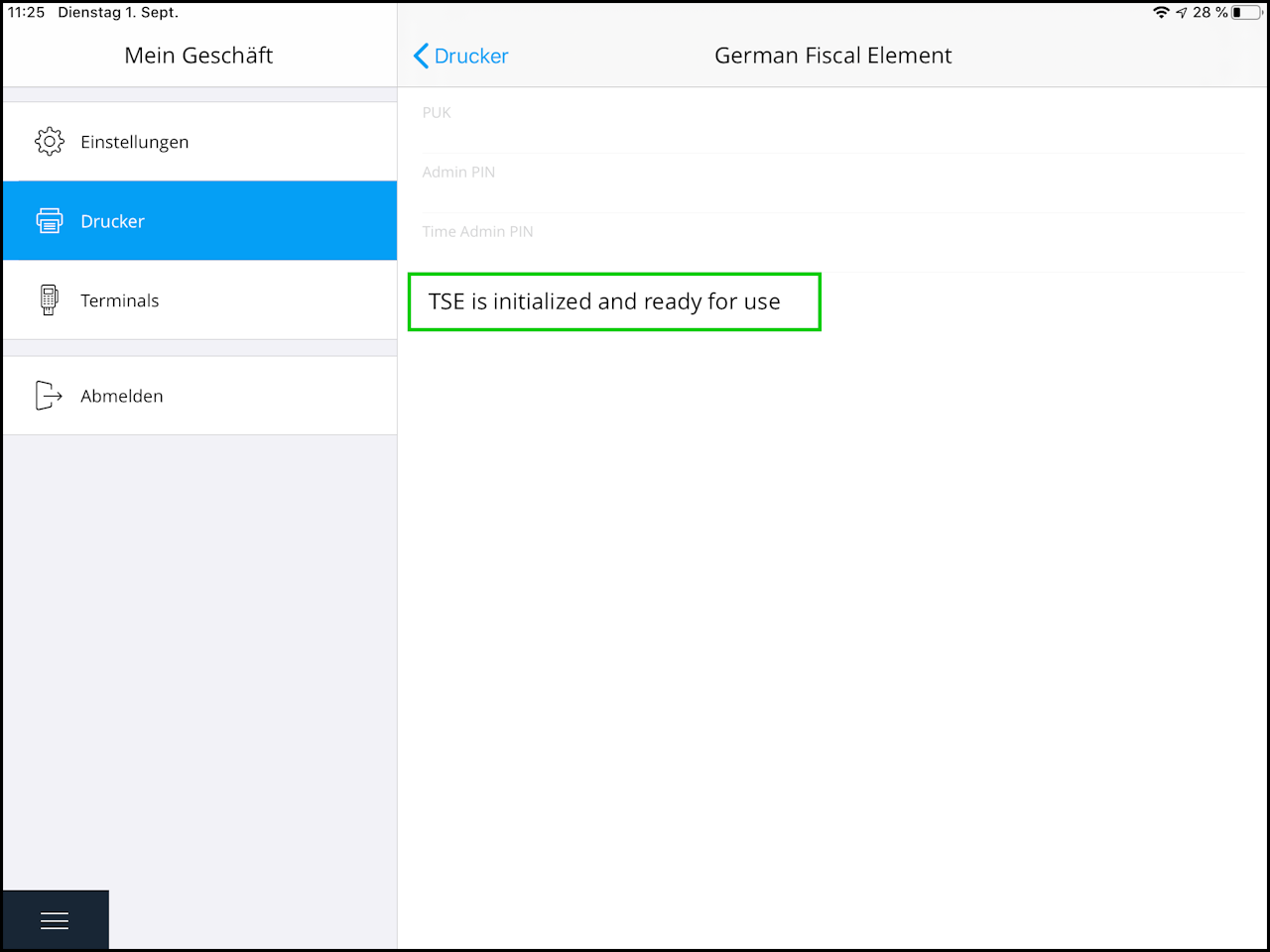 After the printer has been re-added, click on the "TSE Settings" menu item to start setting up the TSE.