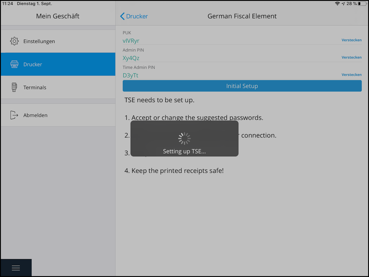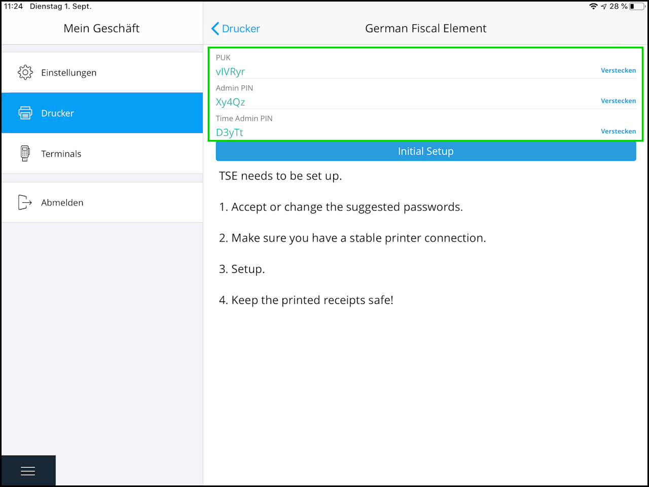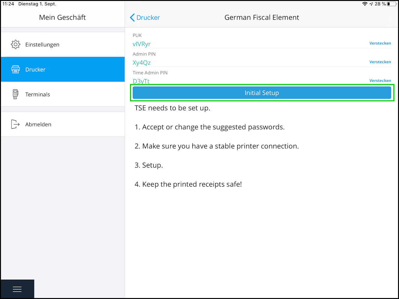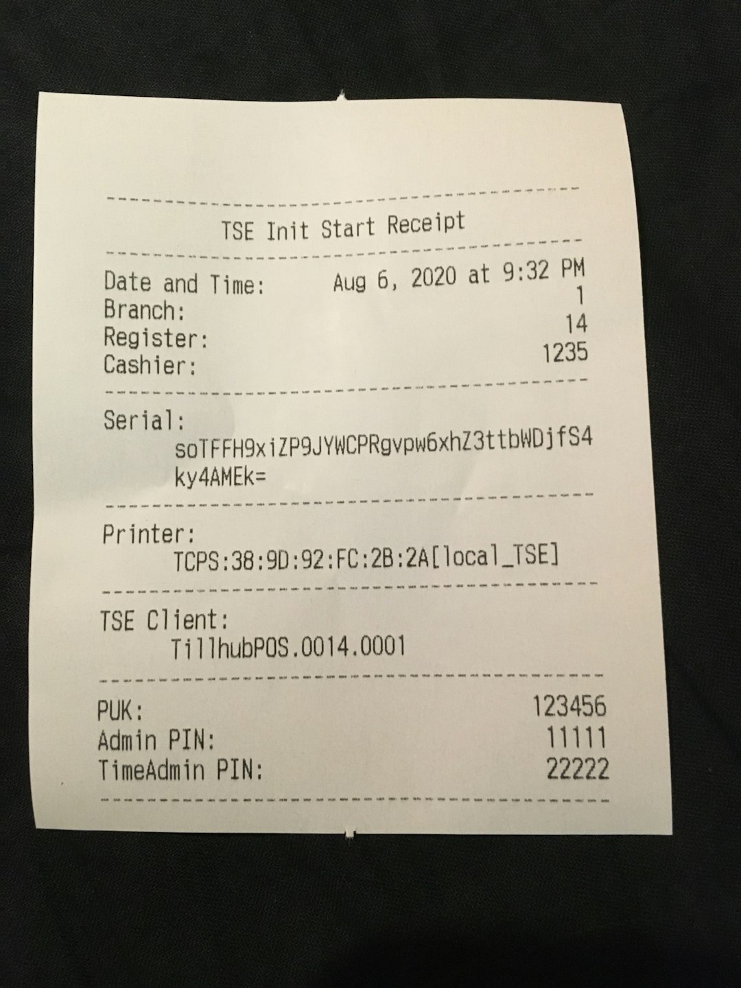 During the initialization process, two receipts with the set passwords and other TSE information will be printed.