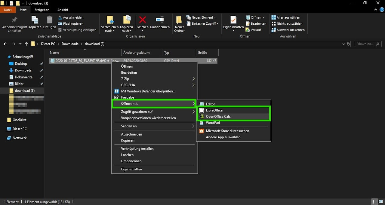 If you use Open-/ Libre Office as your spreadsheet program, you can easily open a CSV file with these programs. The safest method is to select the CSV file with a right-click, then click on "Open with - Libre Office / Open Office" (Image 1).