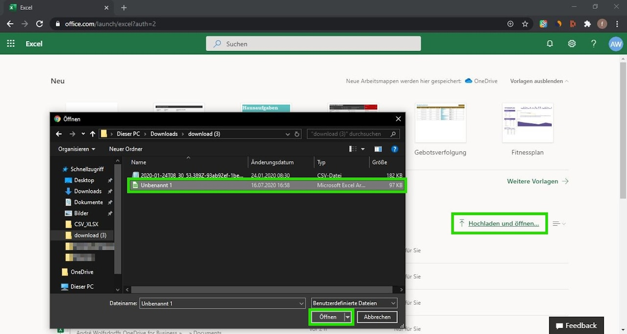 If you want to open the .xlsx file in Excel Web, you need to click on "Upload and Open" on the homepage and then select the appropriate file.