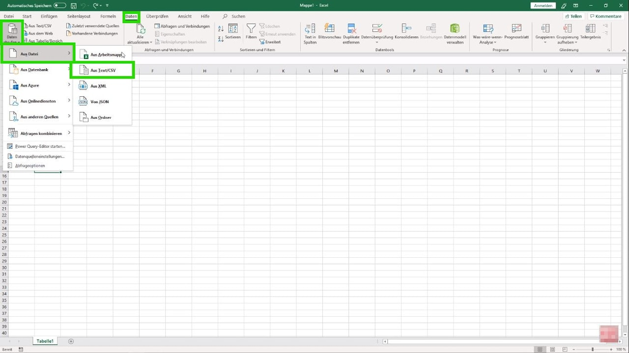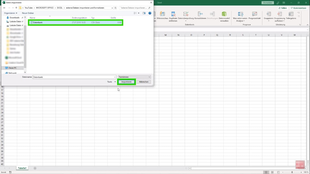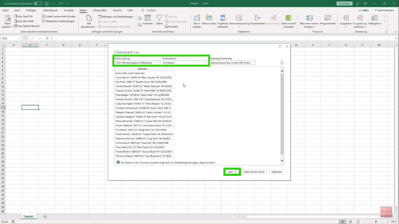 Navigate to the tab "Data - Get Data - From Text/CSV" and select the CSV file you wish to import, then confirm your selection with "Import" (Image 1+2). In the following window, you need to choose the "File Origin" (it is recommended to use Unicode UTF-8 again) and the desired "Delimiter". Once you have made your settings, import the CSV by clicking "Load" (Image 3).