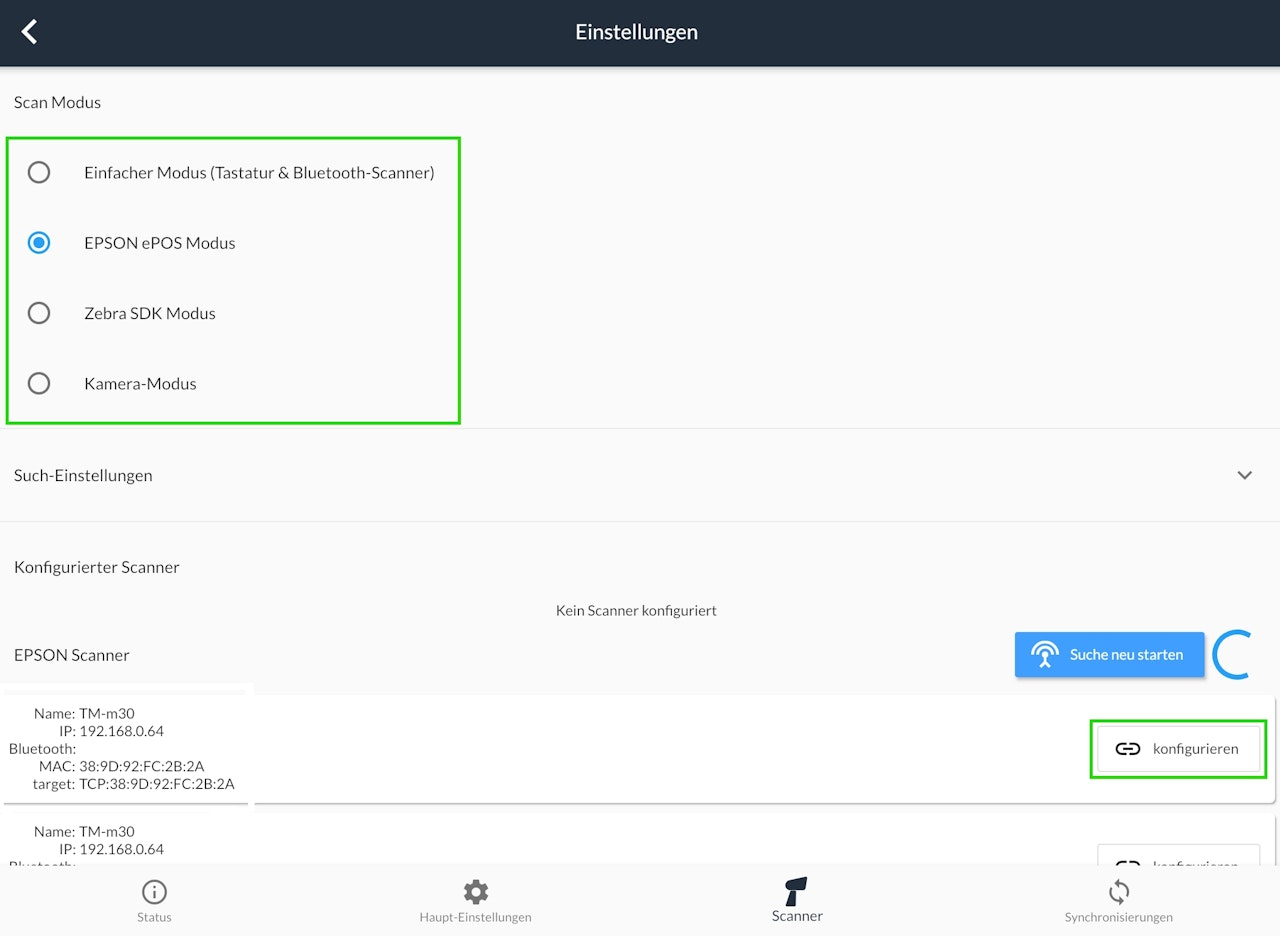 For a scanner connected directly to your Epson printer, select the EPSON ePOS Mode. The scanner will then appear in the list below. Click configure to register it in Warehub.