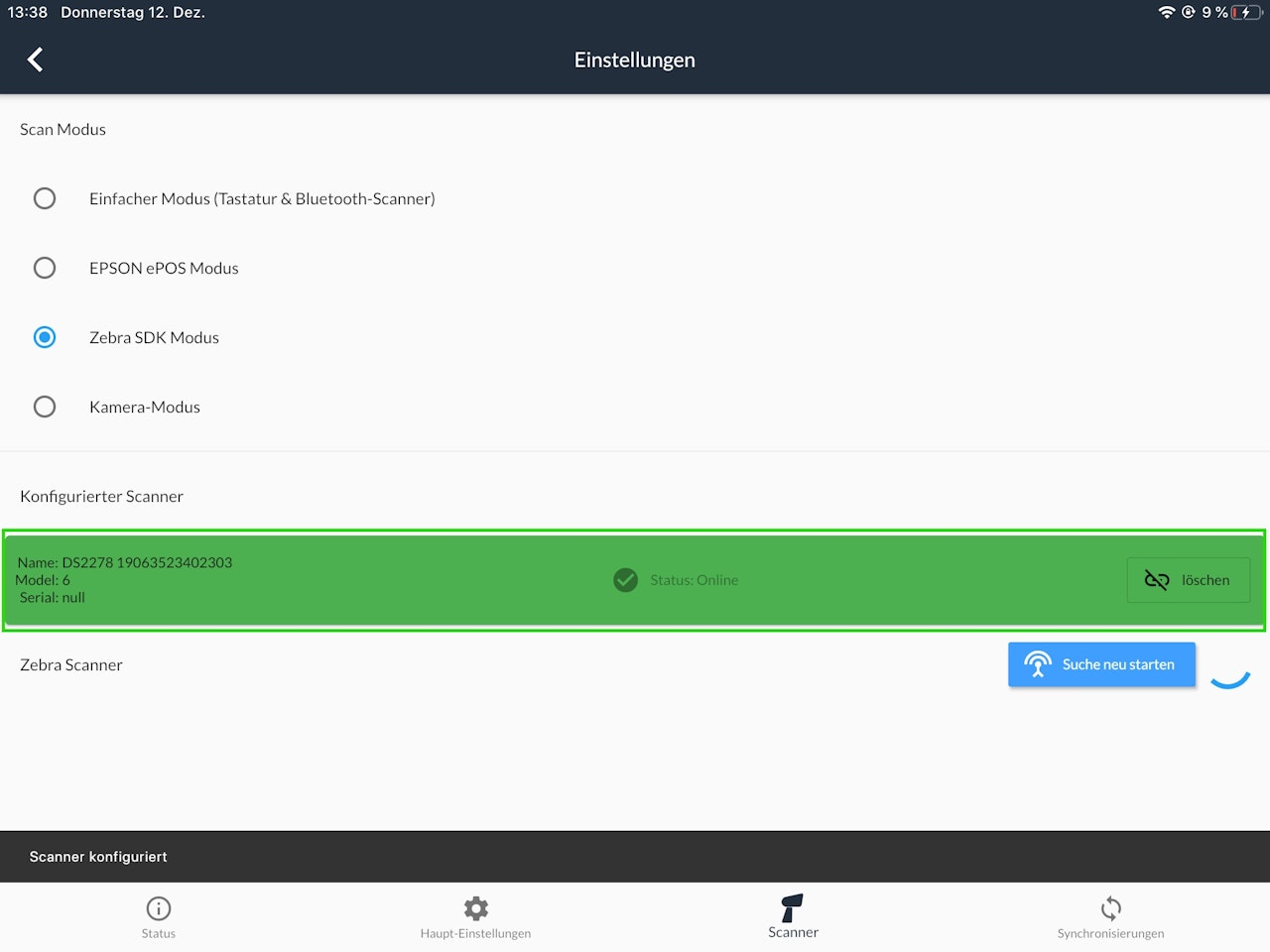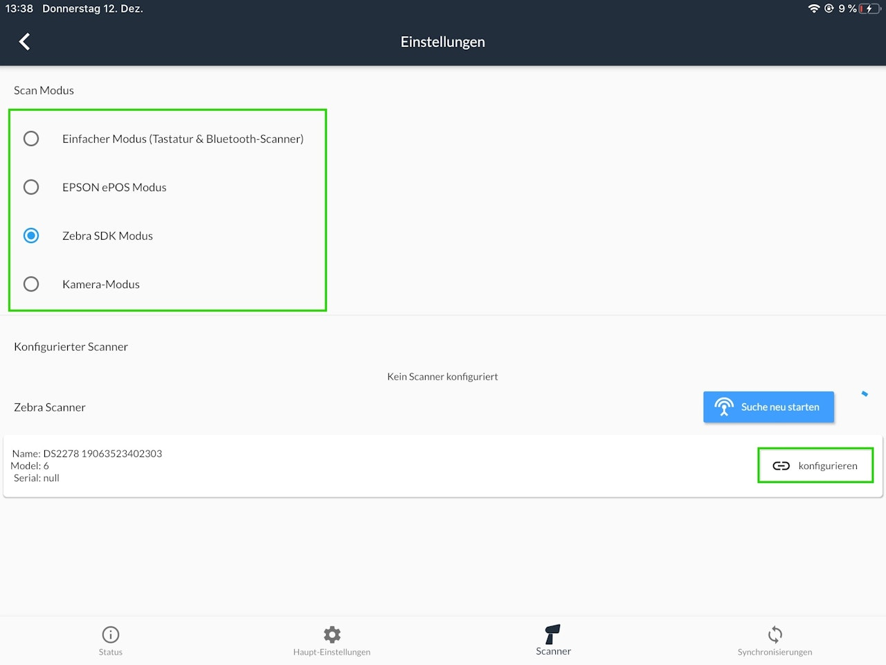 If you use a Metapace scanner, select Zebra SDK Mode. The scanner will show up in the list below and can be selected for configuration in the app.