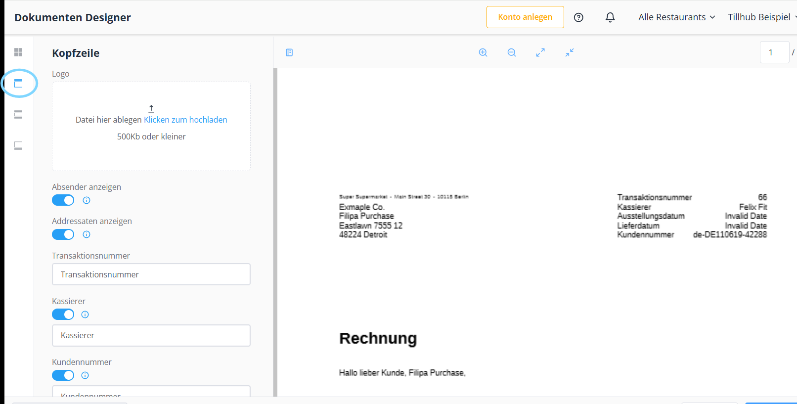 After you have adjusted the “General” section as desired, continue with the “Header.” Here you can set the “Logo,” decide whether “Sender” and “Address details” are displayed, and change the labels for “Transaction number, Cashier and Issue/Delivery date.”