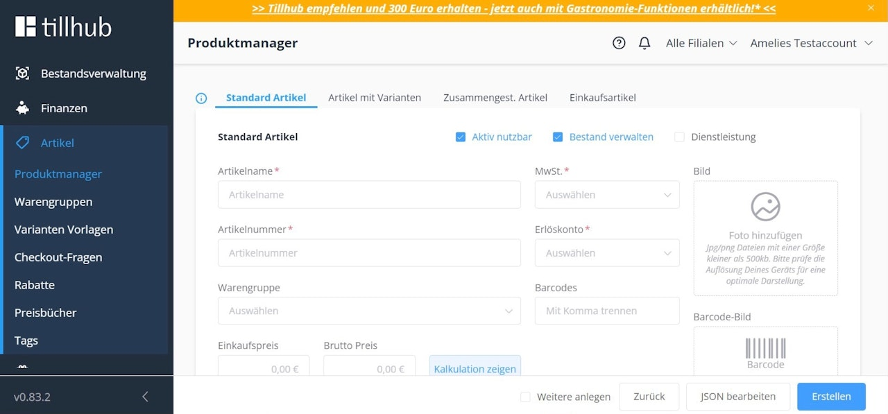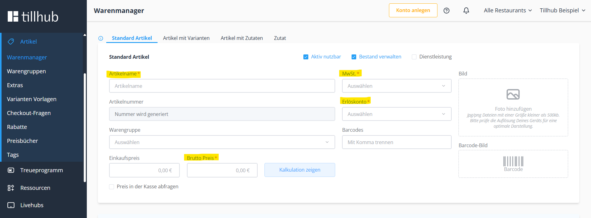 If you select an already created product group in the item creation form, the Revenue Account and VAT fields will be filled automatically. These fields are marked with an asterisk (*). Under Barcodes, you can also enter, for example, the EAN number of your product.