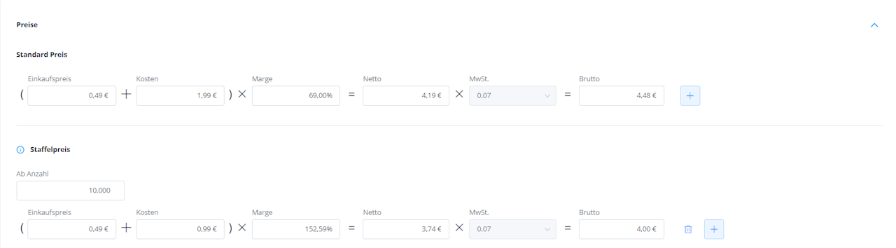 For tiered pricing, you can set different prices depending on the quantity sold. For example, if you want the price to drop from €4.48 to €4.00 per unit starting from a quantity of 10, you can configure this here.