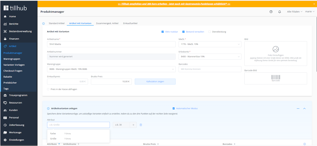 When you go to the product manager and create an item with variants, your created variant templates will be shown in the item edit view as soon as you tap the “Attribute” field.