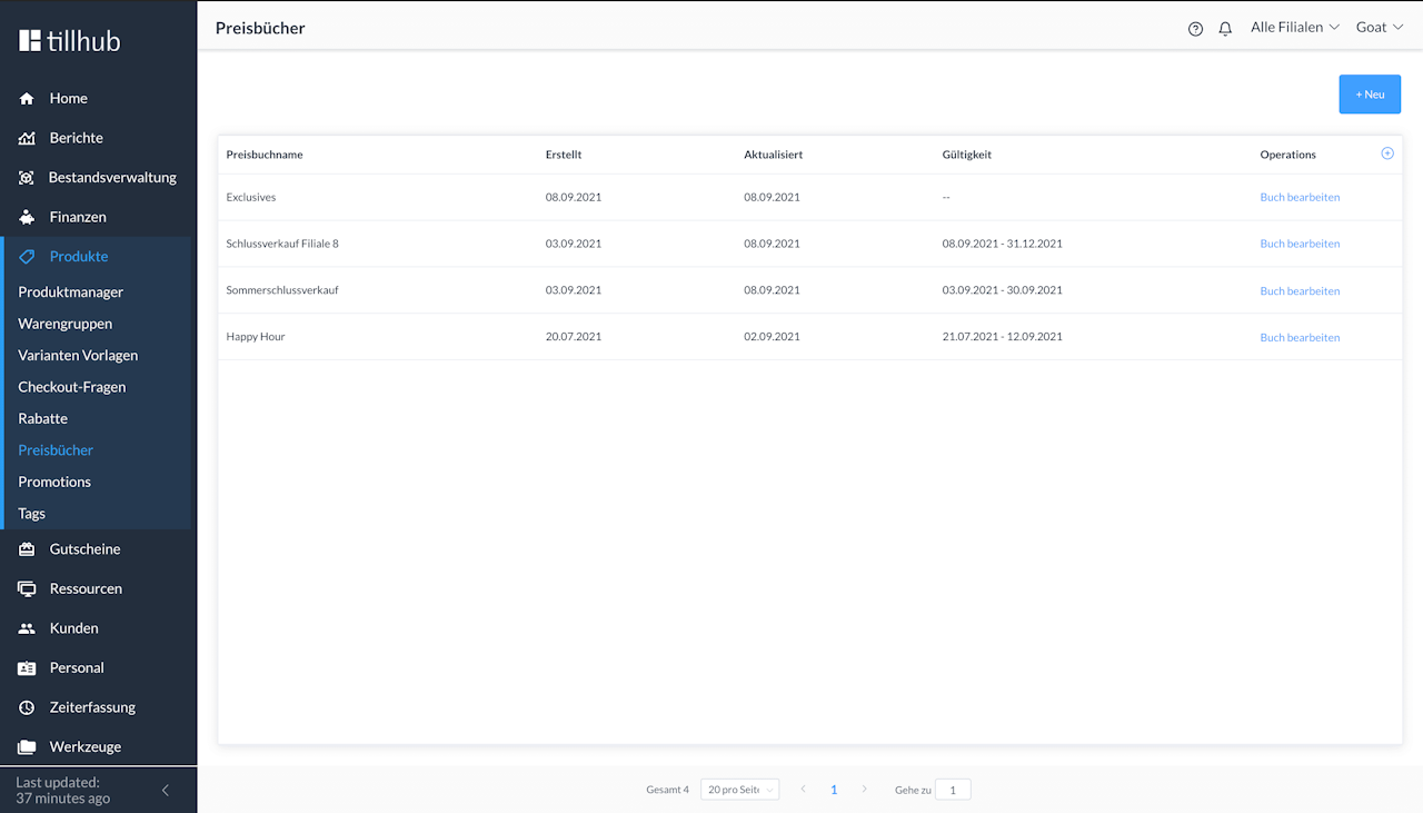 How are price books used? Navigate to “Items” → “Price books”, create a price book, add locations and the validity period, then add any items and product groups and adjust their prices.