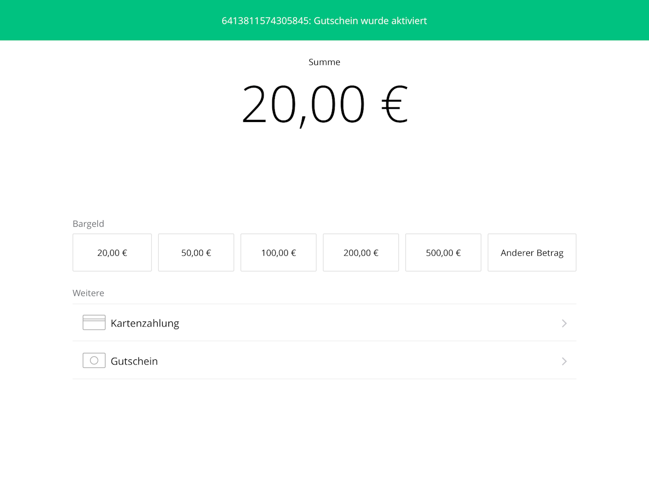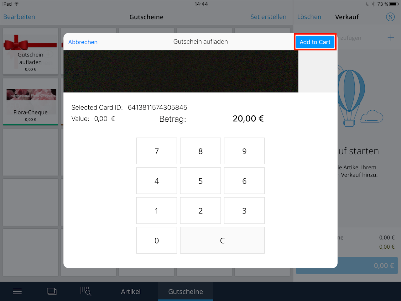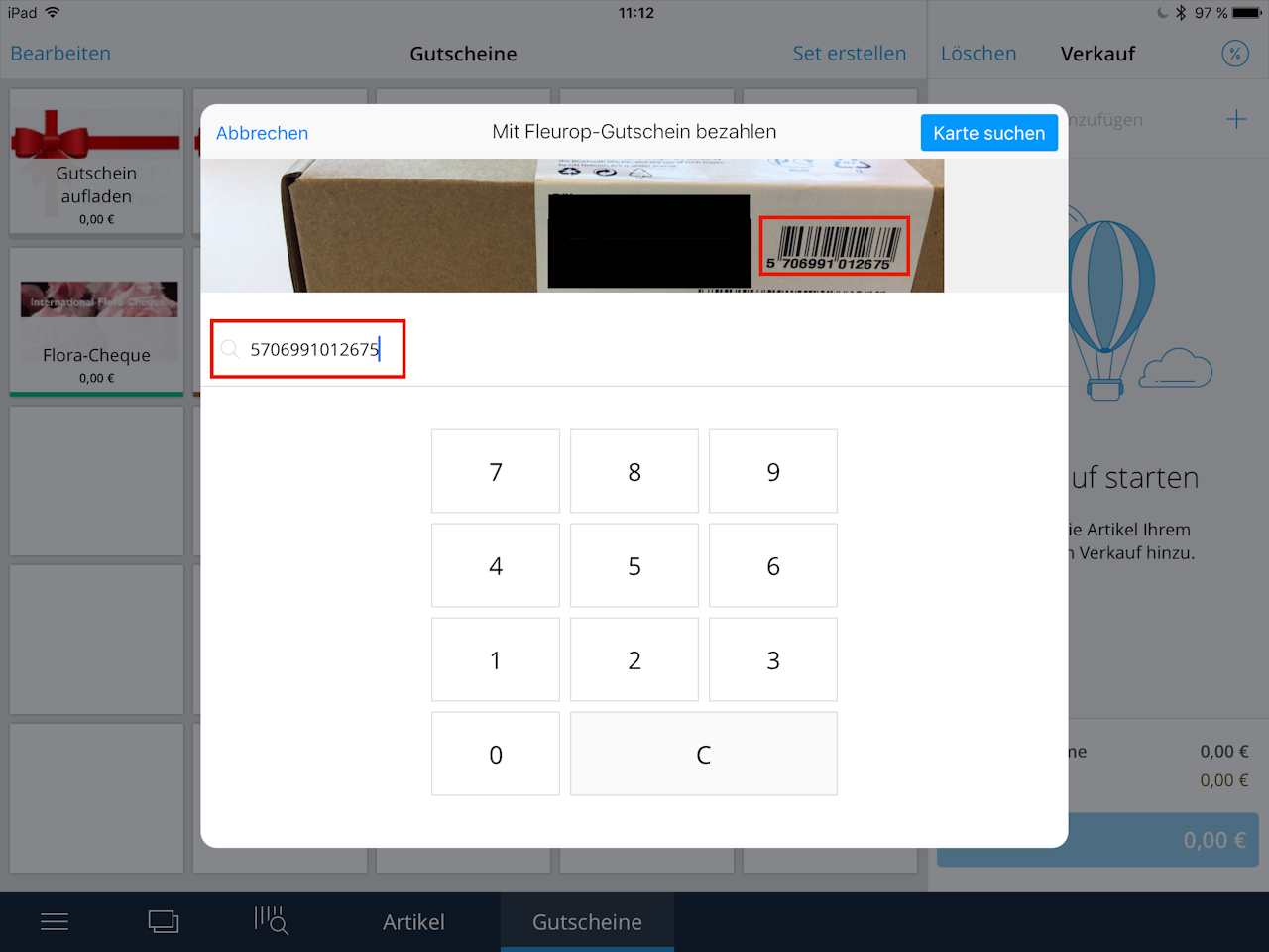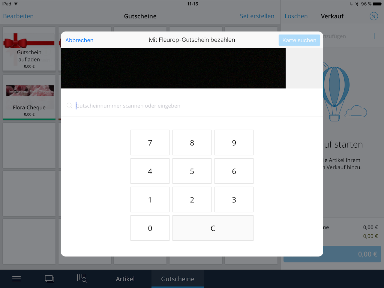 You can scan Fleurop vouchers with the connected scanner as usual to load or redeem them. Alternatively, Fleurop vouchers have an extra feature that lets you scan vouchers using the iPad’s camera.