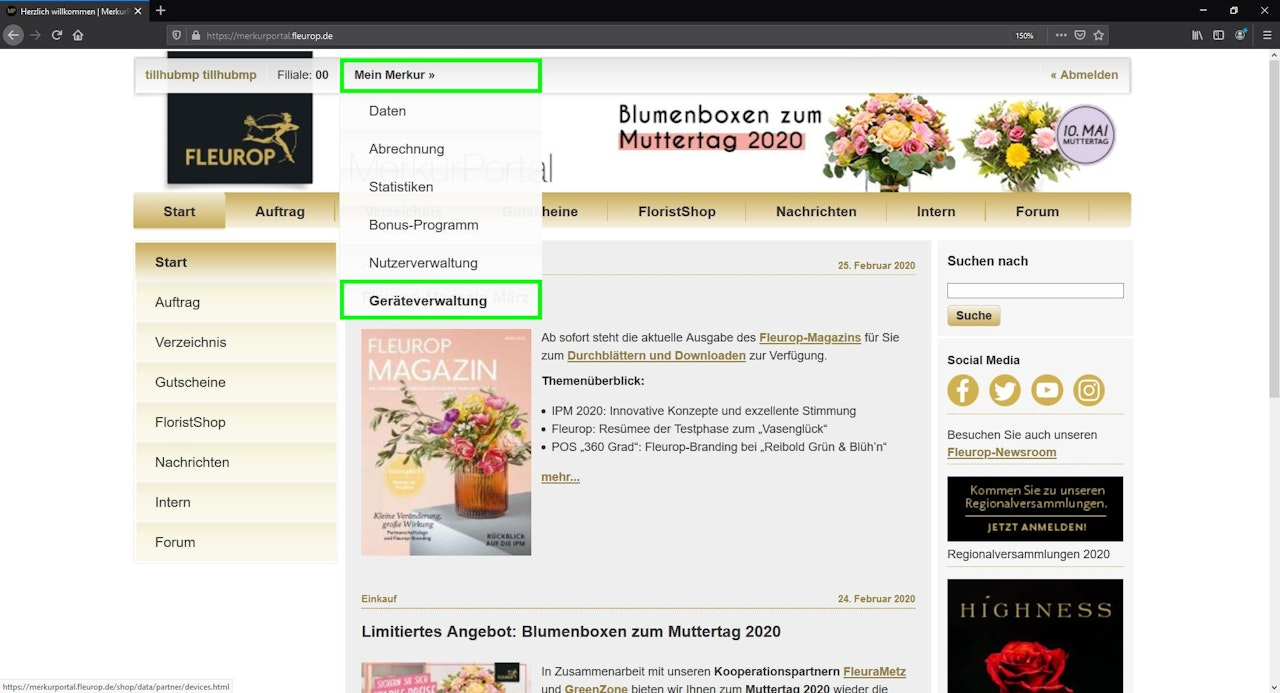 The Fleurop function is located under “My Business.” Enter the respective item numbers in the fields below the Device ID. The item numbers are taken from the Dashboard.