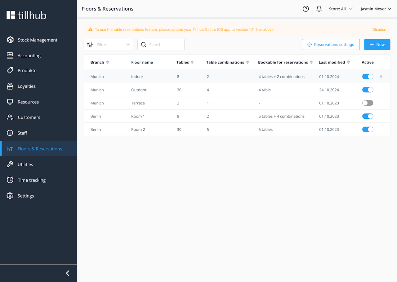 First, go to “Areas & Reservations” in the menu. There you can create different rooms, each with a different number of tables and with table combinations. To create a new room, click “New” in the top right.