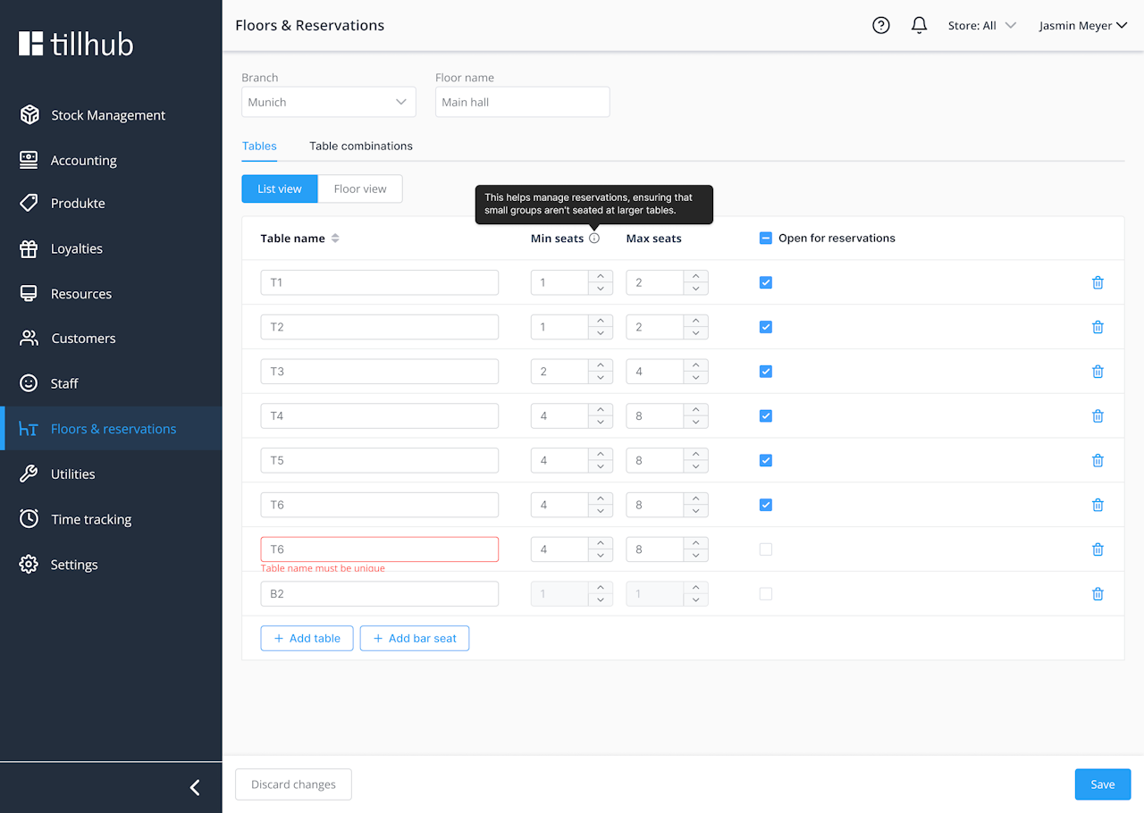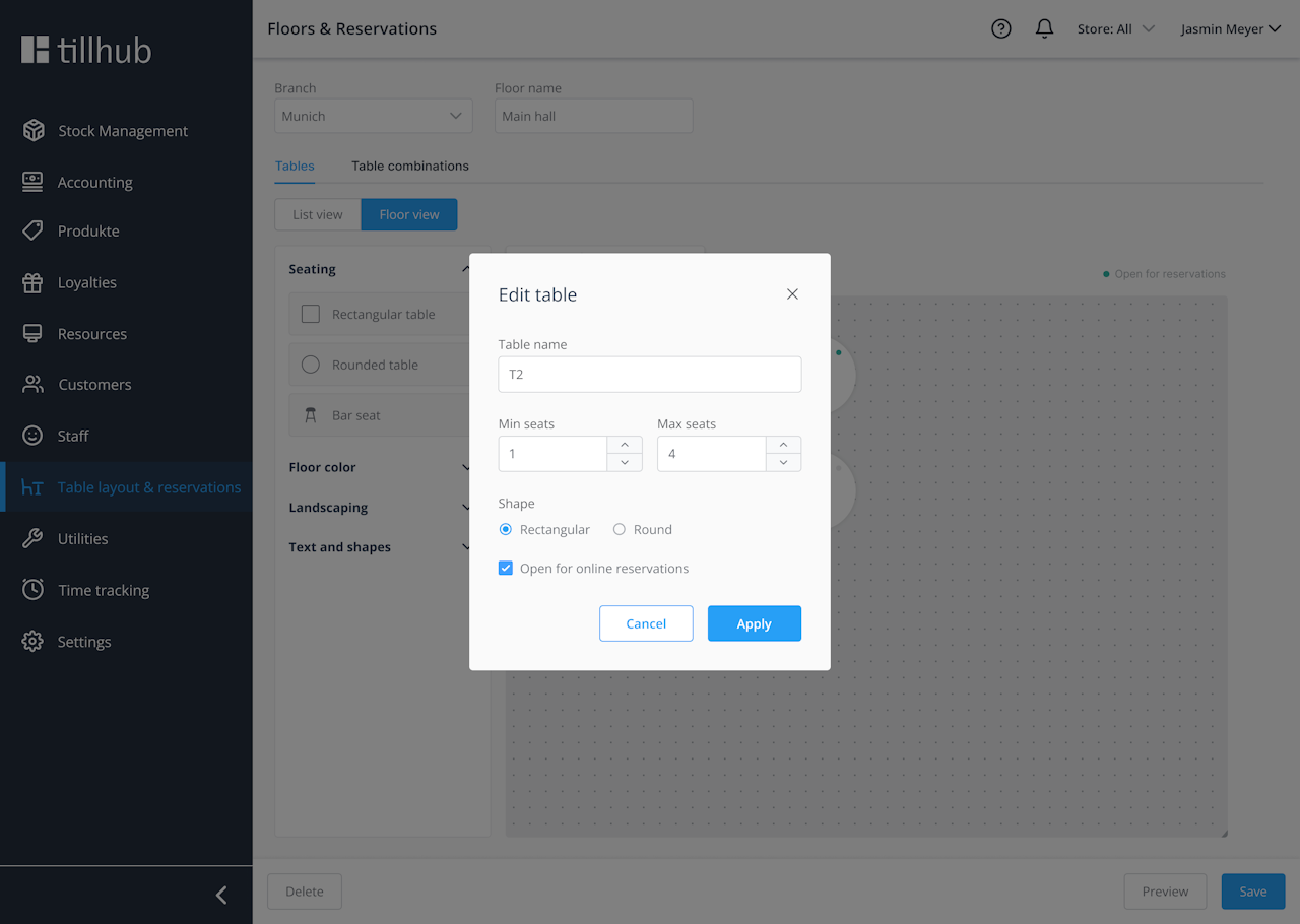 - To edit a table, click it. You can change the table name, set the minimum and maximum number of seats, and tick the box on the right to make the table reservable online.