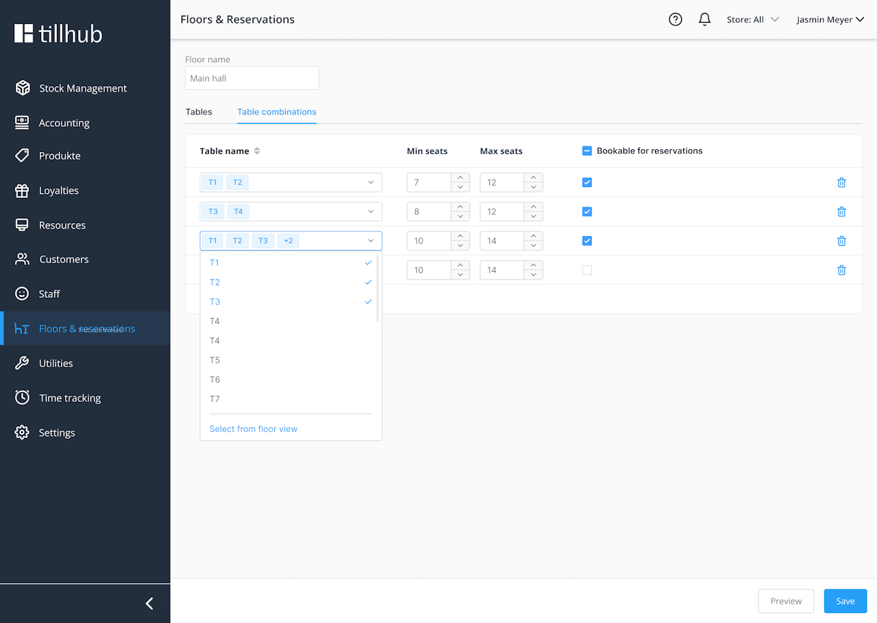 - Another important section is table combinations. Using the tab at the top, you can define which tables may be combined. Select the desired tables in the column, set the minimum and maximum seats, and decide whether this combination should also be reservable online.
