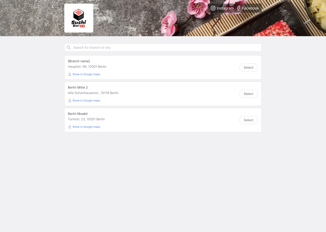 Through the online reservation page, guests can quickly and conveniently book a table at their preferred location. When the page opens, all available branches/restaurants are displayed so the appropriate location can be selected.