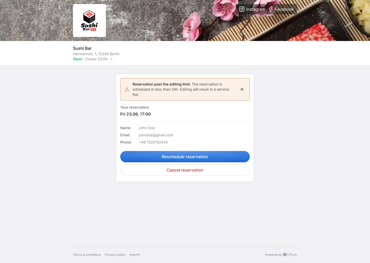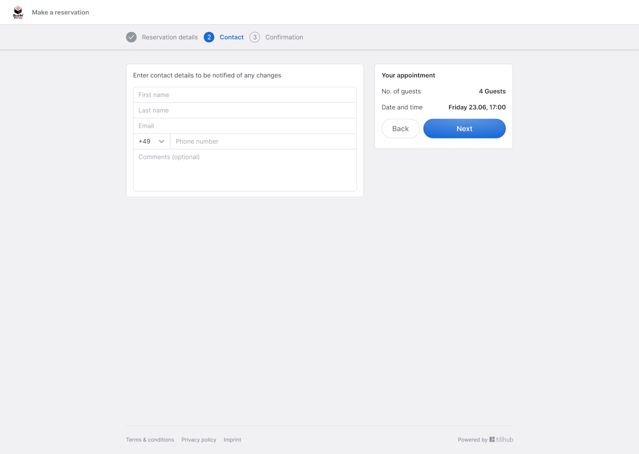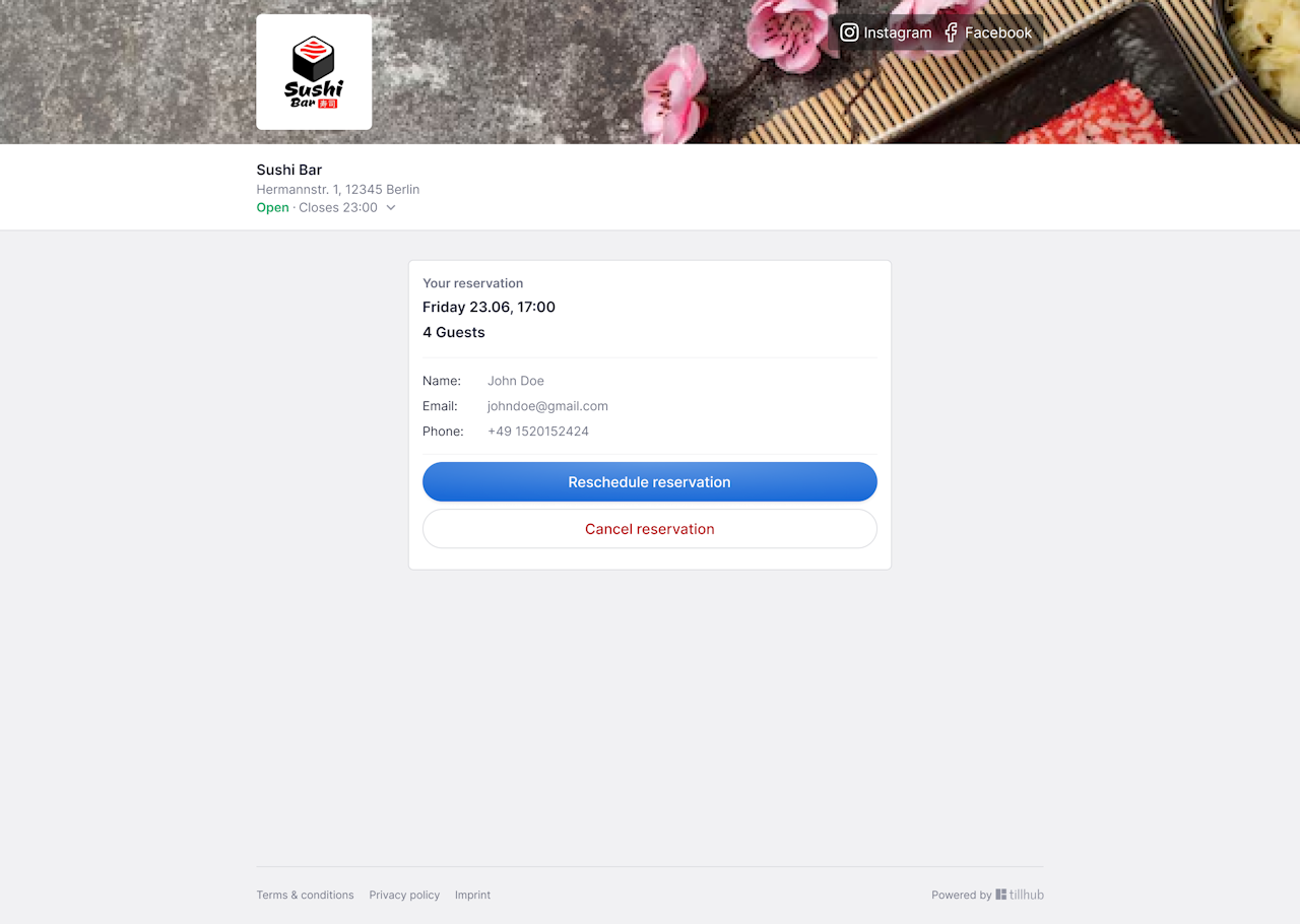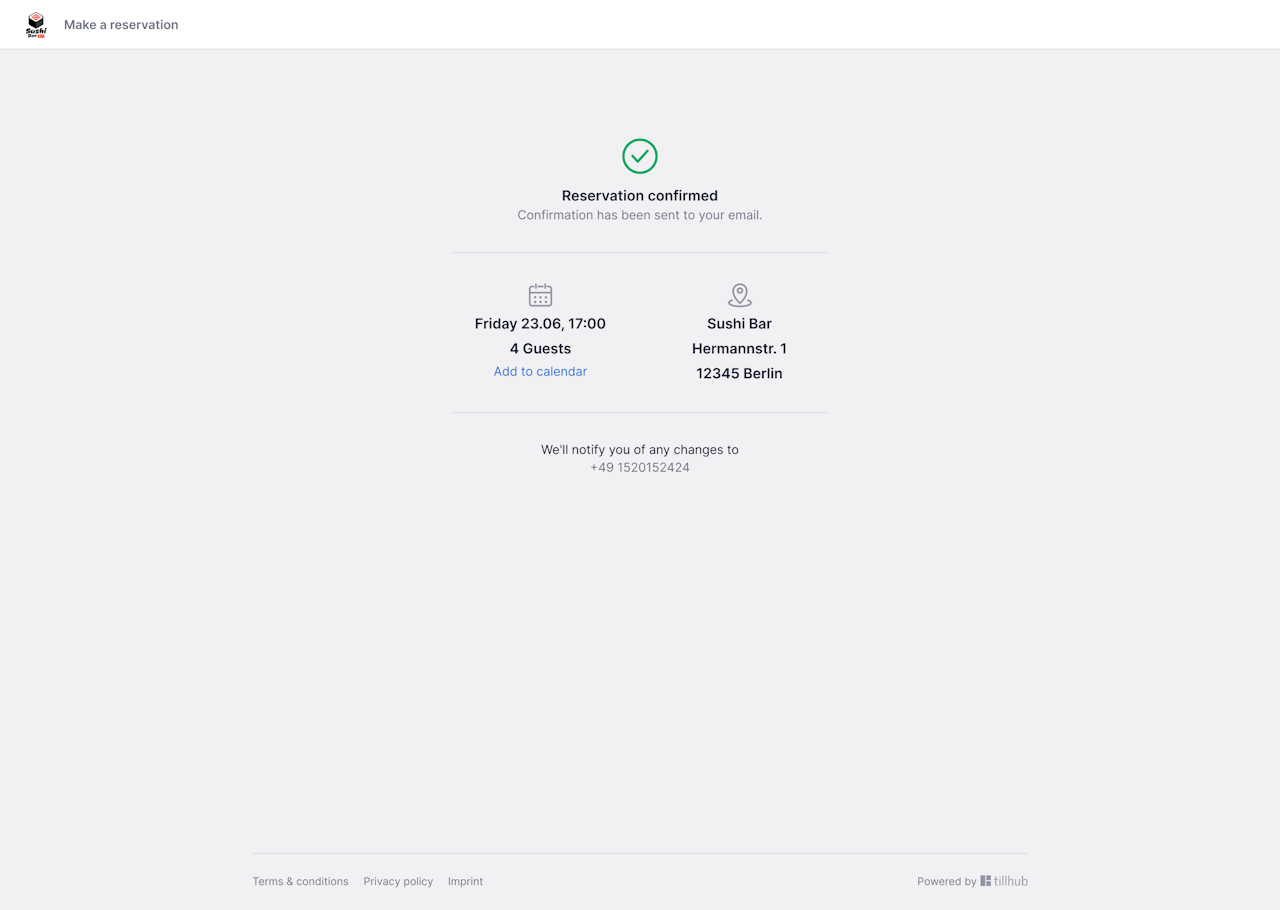 Possible changes include the number of guests, the date, or the time. Each change must be confirmed again and is sent to the guest via an updated confirmation email. A cancellation can be made just as easily via the reservation page, provided it is done within the allowed period.