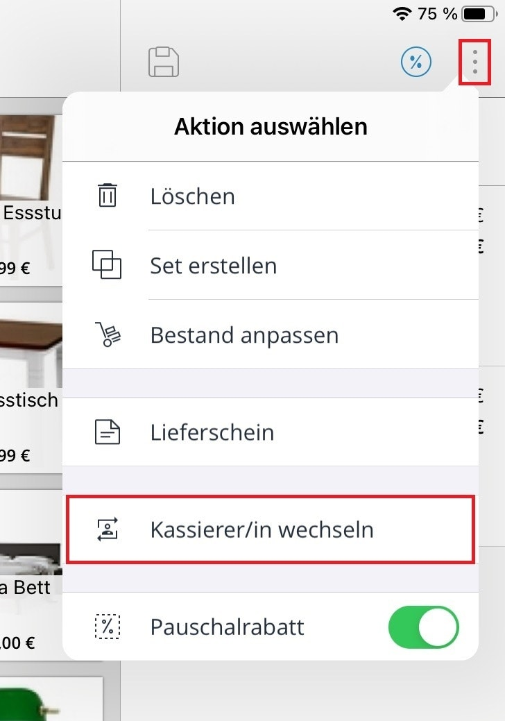 - Alternatively, open the three-dot menu at the top right and tap "Switch cashier".