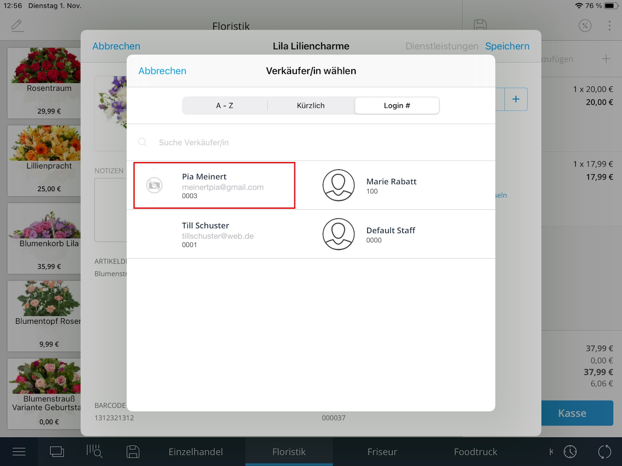 By default, the logged-in cashier profile is also shown as the salesperson profile. If the salesperson role differs from the cashier role in your company, proceed as follows: