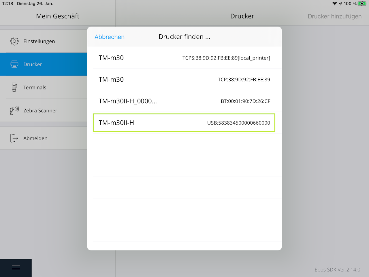 - Tap Add printer. A new window will open where you can select the TM‑m30II‑H.