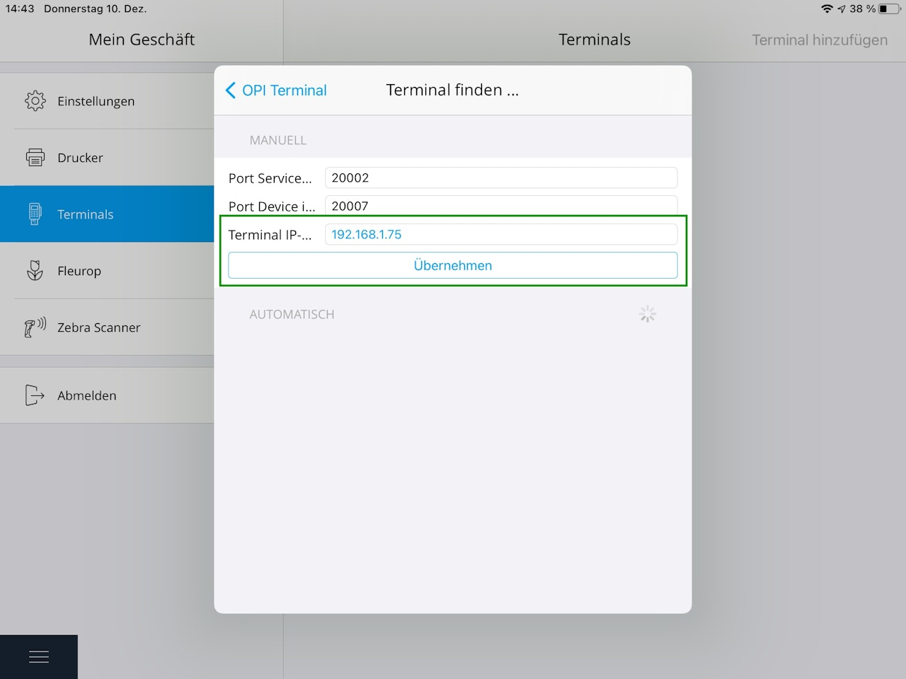 Enter the terminal’s IP address in the “Terminal IP” field under “Manual entry” and tap “Apply.”