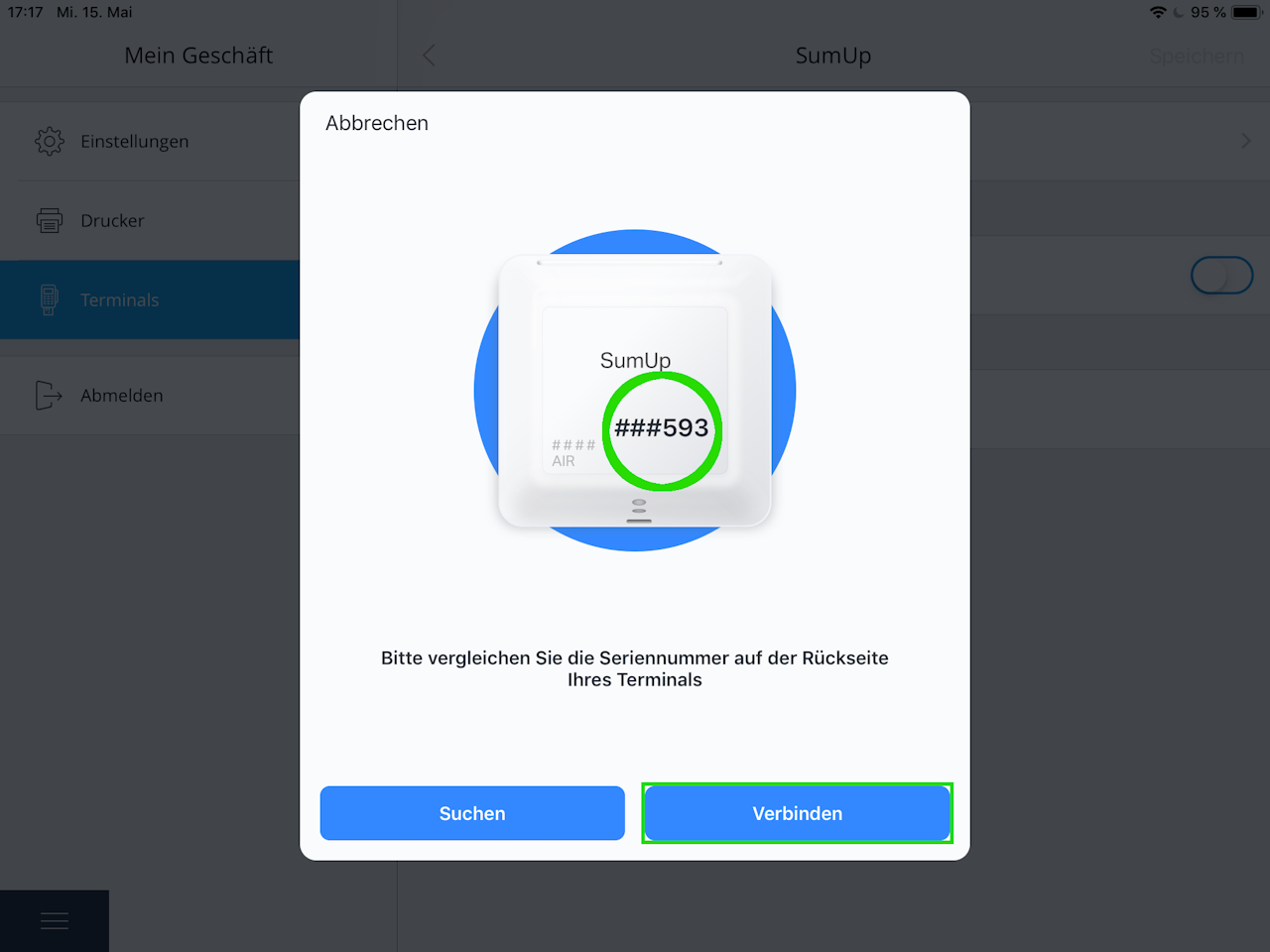 If everything has been done correctly, “SumUp” will now appear in the “Terminals” overview with the status “logged in.” Tap this entry.