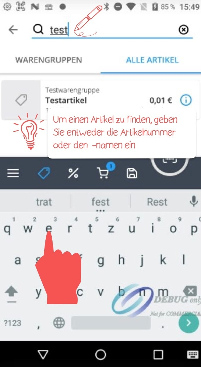 To search for a specific item, you can either scroll up and down the screen or use the search field at the top right. To do this, tap the magnifying glass icon and enter either the item number or the item name. Once you have found the desired item, simply tap it to add it to the shopping cart.