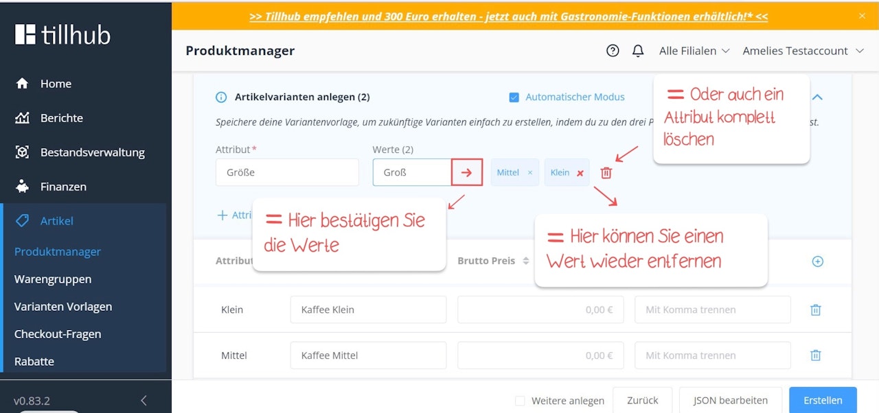 Zunächst sollten Sie die jeweiligen Attribute Ihres "Artikels mit Varianten" festlegen. Als "Attribut" bezeichnen wir die variierende Eigenschaft Ihres Artikels, wie z.B. Größe oder Farbe.